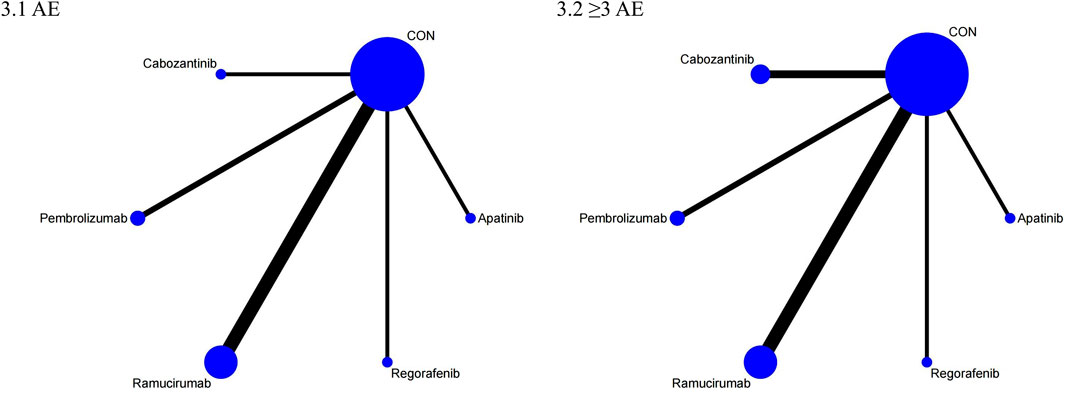 Two diagrams comparing connections among treatments. The left diagram (3.1 AE) and the right diagram (3.2 ≥3 AE) both feature a central node labeled CON, connected to other nodes: Cabozantinib, Apatinib, Pembrolizumab, Ramucirumab, and Regorafenib. The line thickness varies, with the largest connections to CON. Both diagrams use blue circles as nodes.