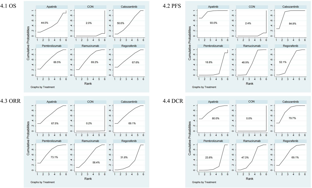 Four panels display cumulative probability graphs for different treatments across four metrics: OS, PFS, ORR, and DCR. Each panel consists of six graphs labeled for treatments: Apatinib, CON, Cabozantinib, Pembrolizumab, Ramucirumab, and Regorafenib. Probabilities vary, with notable values like Apatinib's high probabilities in OS and PFS, while CON remains lowest across metrics. Each graph plots cumulative probabilities against treatment ranks, highlighting performance variations.