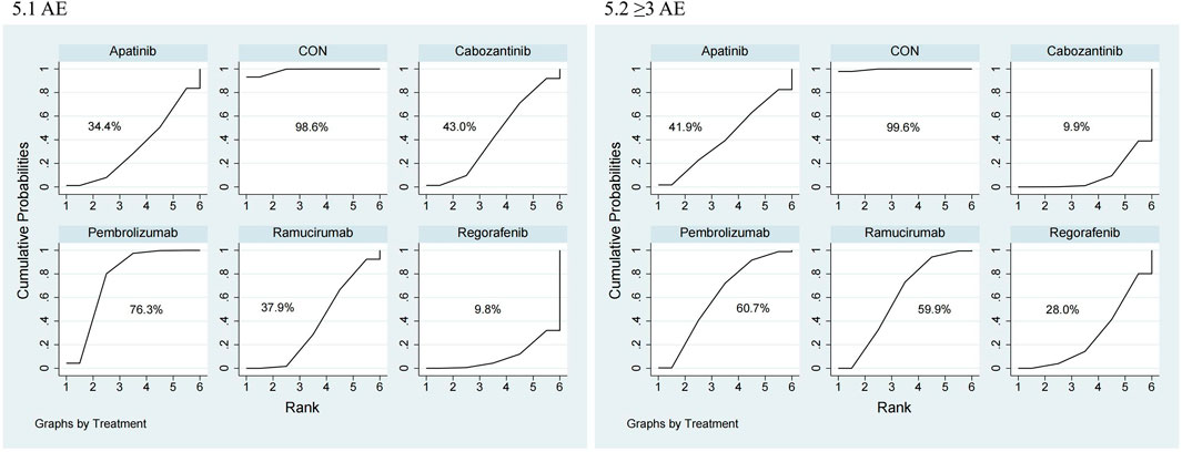 As shown in Table 3, the control group significantly reduced the incidence of ≥3 AEs in comparison to all second-line therapies, specifically contrasted to Pembrolizumab (OR = 0.54, 95% CI = 0.35, 0.85), Ramucirumab (OR = 0.53, 95% CI = 0.37, 0.77), Apatinib (OR = 0.44, 95% CI = 0.20, 0.96), Regorafenib (OR = 0.38, 95% CI = 0.24, 0.61), and Cabozantinib (OR = 0.30, 95% CI = 0.21, 0.44). Additionally, Ramucirumab substantially lowered the occurrence of ≥3 AEs in comparison to Cabozantinib (OR = 0.57, 95% CI = 0.33, 0.97).