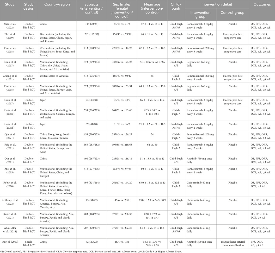 An aggregate of 3,746 documents were found via a preliminary electronic screening. Following the elimination of 2,168 duplicate data, 1,578 publications were evaluated based on their titles and abstracts. After excluding 1,512 research based on their titles and abstracts, 66 full-text papers were evaluated for inclusion. Ultimately, 18 RCTs were incorporated into the systematic review and NMA (Bruix et al., 2017; Zhu et al., 2015; Zhu et al., 2019; Abou-Alfa et al., 2018; Chiang et al., 2021; El-Khoueiry et al., 2022; Finn et al., 2018; Finn et al., 2020; Kelley et al., 2022; Kelley et al., 2020; Kudo et al., 2020a; Kudo et al., 2017; Kudo et al., 2020b; Lu et al., 2017; Qin et al., 2023; Qin et al., 2021; Reig et al., 2021; Shao et al., 2022), encompassing a total of 6,910 individuals with advanced HCC. It should be noted that the number of included studies and participants may vary slightly across specific outcomes due to incomplete reporting or different evaluable populations in certain trials. The flow of included studies is shown in Figure 1, and detailed characteristics are shown in Table 1.