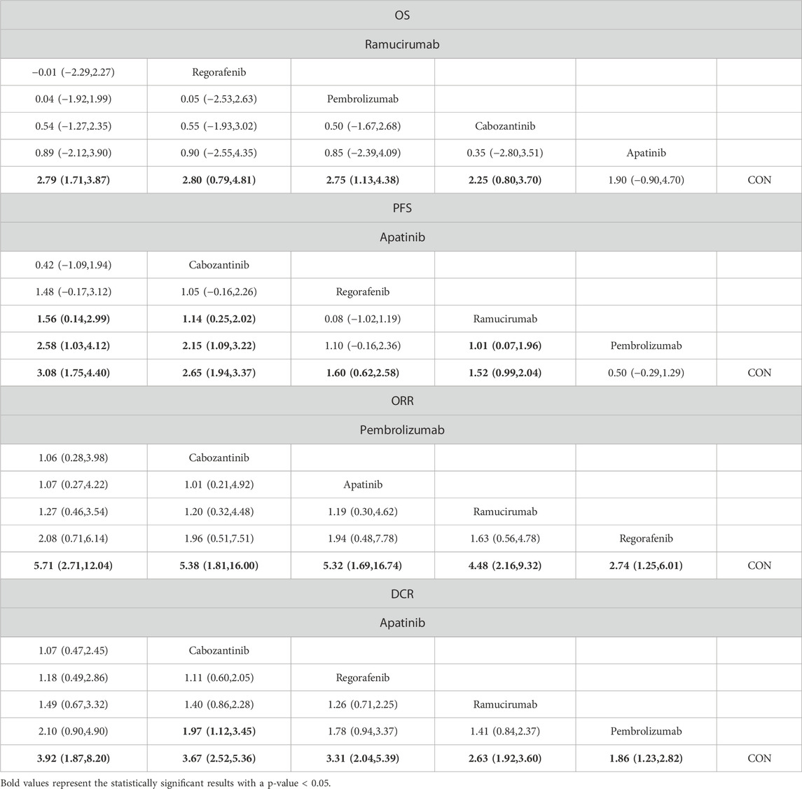 As shown in Table 2, all therapies markedly enhanced the ORR in comparison to the control cohort. Specifically, contrasted to the control cohort, Pembrolizumab (OR = 5.71, 95% CI = 2.71, 12.04), Cabozantinib (OR = 5.38, 95% CI = 1.81, 16.00), Apatinib (OR = 5.32, 95% CI = 1.69, 16.74), Ramucirumab (OR = 4.48, 95% CI = 2.16, 9.32), and Regorafenib (OR = 2.74, 95% CI = 1.25, 6.01) all significantly increased ORR.