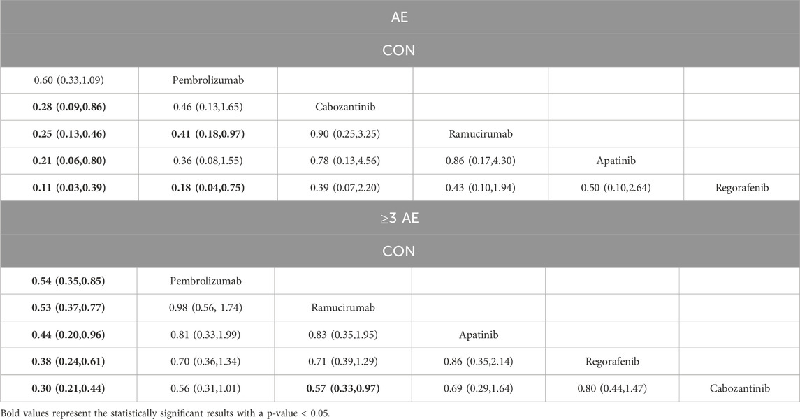 As shown in Table 3, compared to Cabozantinib, Ramucirumab (OR = 0.25, 95% CI = 0.13, 0.46), Apatinib (OR = 0.21, 95% CI = 0.06, 0.80), and Regorafenib (OR = 0.11, 95% CI = 0.03, 0.39) substantially lowered the occurrence of AEs; Pembrolizumab significantly reduced AEs compared to Ramucirumab (OR = 0.41, 95% CI = 0.18, 0.97) and Regorafenib (OR = 0.18, 95% CI = 0.04, 0.75).