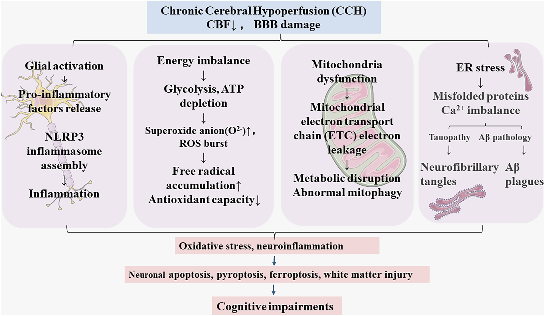 Figure 1 illustrates major pathophysiology of CCH: Cerebral blood flow (CBF) reduction during CCH leads to blood brain barrier dysfunction (Rajeev et al., 2022; Xu et al., 2022). The BBB tightly regulates the movements between blood and brain, BBB breakdown could cause energy imbalance, glial activation and neuroinflammation, endoplasmic reticulum (ER) stress, and mitochondrial dysfunction (Rajeev et al., 2023), which initiates a vicious cycle contributing to microglia over-activation (Zhang et al., 2024), mitochondrial dysfunction (Wang Y. et al., 2023), mitophagy dysregulation (Chen et al., 2024), oxidative damage (Rajeev et al., 2023), leading to neuronal apoptosis, ferroptosis (Zhao et al., 2022), pyroptosis (He et al., 2023), and white matter injury (Kimura et al., 2025). These pathologies ultimately result in cognitive impairments and progress to CSVD, AD, and VaD.