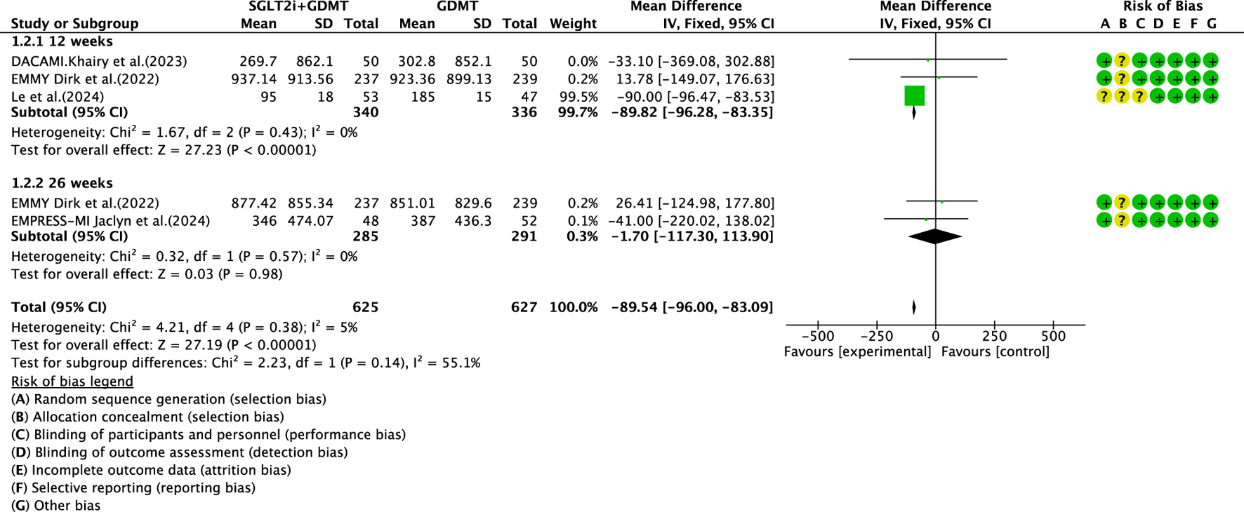 ![Forest plot showing the effects of SGLT2i+GDMT versus GDMT alone on various studies at 12 and 26 weeks. The overall mean difference favors the experimental group (-89.54 [-96.00, -83.09]). The risk of bias is indicated with green for low risk, yellow for unclear risk, and red for high risk across categories A to G.](https://www.frontiersin.org/files/Articles/1699066/xml-images/fphar-16-1699066-g006.webp)