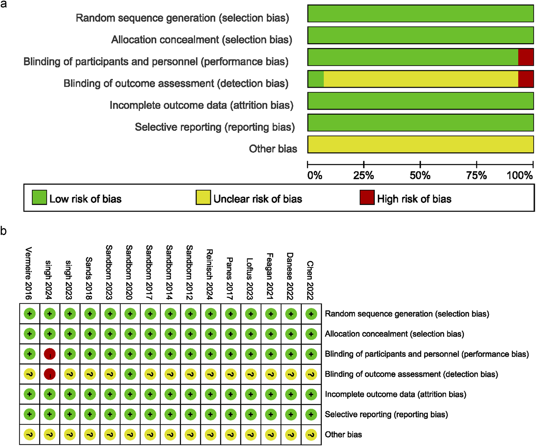 The analysis included 15 articles with data from 6,466 patients with IBD. The JAK inhibitor drugs examined were brepocitinib, filgotinib, ivarmacitinib, peficitinib, ritlecitinib, tofacitinib, and upadacitinib. Their doses ranged from 0.5 to 200 mg. Table 1 provides a detailed overview of the literature’s specific characteristics. All of the studies included in the current analysis provided clear and detailed explanations of the blinding method. The main risk was the potential for deviations from the expected intervention. Figures 2a,b present a detailed deviation risk assessment of the included studies.