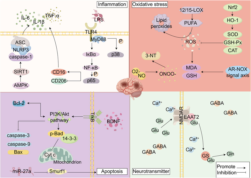 Inflammation serves as a fundamental pathological process underlying the damage in ischemic stroke. Pattern recognition receptors, such as Toll-like receptors (TLRs), are crucial regulators of the inflammatory response in ischemia/reperfusion injury (Yang et al., 2021). Under conditions of ischemic/reperfusion injury, toll-like receptor 4 (TLR4) is activated and facilitates the recruitment of myeloid differentiation primary response protein 88 (MyD88) (Zhang X. et al., 2017). Interleukin-1 Receptor-Associated Kinase 4 (IRAK4) interacts directly with MyD88, and activated IRAK4 is recruited to TNF Receptor Associated Factor 6 (TRAF6). This subsequently leads to the activation of the Inhibitor of kappaB Kinase (IKK) signaling cascade via Transforming Growth Factor-β-Activated Kinase 1 (TAK1), ultimately resulting in the activation of the Nuclear Factor kappa-B (NF-κB) pathway (Kang et al., 2023), the activation of NF-κB directly induces the production of pro-inflammatory cytokines, including Tumor Necrosis Factor (TNF)-α and Interleukin (IL)-6 (Ciesielska et al., 2021). Furthermore, TLR4 signaling contributes to the activation of the NLRP3 inflammasome, promoting the cleavage of pro-IL-1β and pro-IL-18 by Cysteine-dependent aspartate-directed protease-1 (caspase-1) into their active forms, IL-1β and IL-18 (Ciesielska et al., 2021; Xu S. et al., 2024). Additionally, the Mitogen-Activated Protein Kinase (MAPK) pathway, which can be activated by TAK1, stimulates p38, ERK, and JNK, thereby fostering the production of pro-inflammatory cytokines such as TNF-α and IL-6 and mediating the inflammatory response (Zhang P. et al., 2020). Numerous studies have demonstrated that the activation of microglia and astrocytes plays a central role in mediating neuroinflammation (Liu M. et al., 2020). Microglia can polarize into the pro-inflammatory M1 phenotype, often associated with increased expression of ionized calcium-binding adapter molecule 1 (Iba-1), or the anti-inflammatory M2 phenotype (Jiang et al., 2020; Yu et al., 2022). Similarly, astrocytes can adopt a neurotoxic A1 phenotype, characterized by elevated expression of Glial Fibrillary Acidic Protein (GFAP), or a neuroprotective A2 phenotype (Xu D. et al., 2021; Liang et al., 2023). During the early stages of ischemic stroke, activated pro-inflammatory microglia can disrupt gap junctions and enhance the permeability of connexin 43 (Cx43) hemichannels on astrocytes through the release of pro-inflammatory factors, conversely, astrocytes can promote the polarization of microglia towards a pro-inflammatory phenotype via their Cx43 hemichannels, creating a vicious cycle that exacerbates the neuroinflammatory cascade and amplifies damage following ischemic stroke (Liang et al., 2023). It is noteworthy that pericytes surrounding cerebral microvessels contribute to the pro-inflammatory response by generating TLR4 after ischemic stroke (Alsbrook et al., 2023). A1 astrocytes participate in cerebral ischemia-induced neuroinflammation through the TLR4/NF-κB signaling pathway (Liu R. et al., 2024). As primary cellular expressers of TLR4, activated microglia further induce the infiltration of inflammatory cells and the production of cytokines, adhesion molecules, chemokines, and other inflammatory mediators. This process promotes the accumulation and infiltration of neutrophils into the ischemic area, ultimately establishing a persistent vicious cycle of inflammation. Collectively, these pathological processes lead to the disruption of the BBB and exacerbate secondary neuronal apoptosis (Liu M. et al., 2020; Alsbrook et al., 2023).