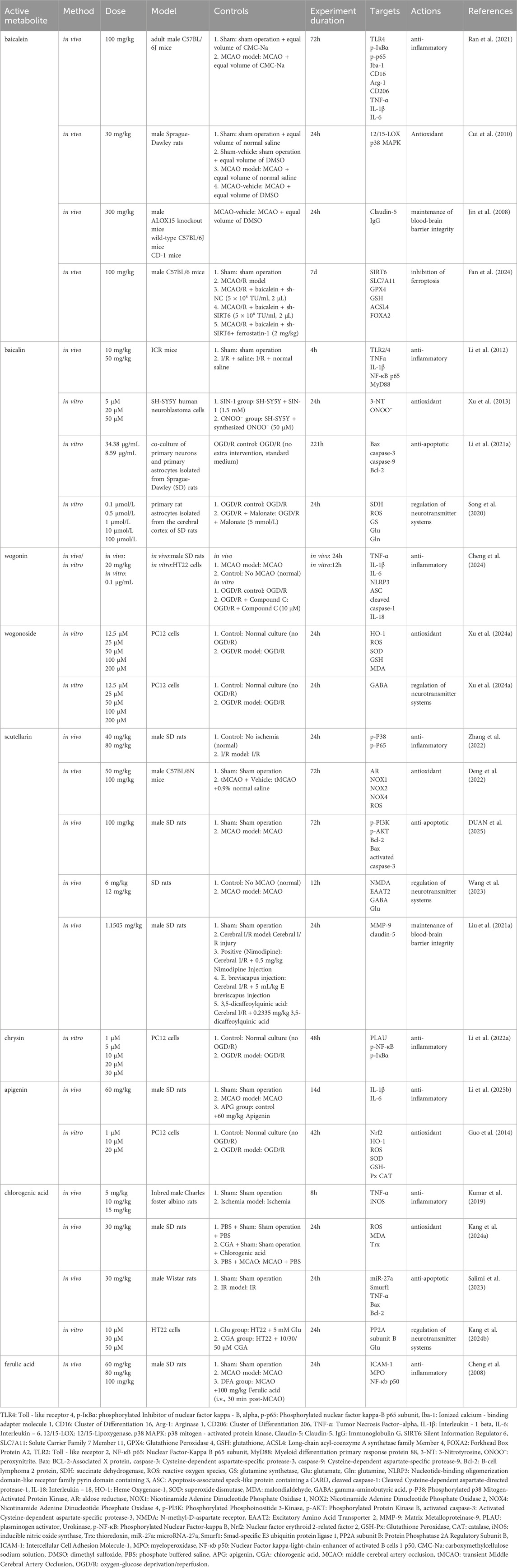 Anti-inflammatory effects of baicalein in ischemic stroke models via multiple pathways. Studies have demonstrated that baicalein exerts anti-inflammatory effects in models of ischemic stroke through multiple mechanisms. It significantly reduces serum levels of IL-6, IL-1β, and TNF-α in mouse models of ischemic stroke, thereby attenuating systemic inflammation post-stroke (Zhang LK. et al., 2025). Mechanistically, in Middle Cerebral Artery Occlusion (MCAO) models, baicalein modulates the TLR4/NF-κB pathway by reducing microglial TLR4 expression, inhibiting IKBα and p65 phosphorylation, and decreasing p65 nuclear translocation. Consequently, it downregulates mRNA expression of the pro-inflammatory marker CD16 while upregulating the anti-inflammatory marker CD206 (Ran et al., 2021). Additionally, baicalein significantly suppresses phosphorylation of JNK, ERK, and P38 proteins via the MAPK signaling pathway in MCAO rat models, thereby reducing neuroinflammatory signaling and brain injury induced by ischemic stroke (Yang et al., 2019). Baicalin also targets the TLR4/NF-κB signaling pathway to exert anti-inflammatory effects. In oxygen-glucose deprivation (OGD)-induced PC12 cells, baicalin specifically targets TLR4, downregulating TLR4 and MyD88 expression, blocking p65 nuclear translocation, and thereby inhibiting downstream NF-κB pathway activation. This leads to reduced release of TNF-α and IL-1β (Li et al., 2012). In vivo studies further confirmed that in a mouse model of ischemia/reperfusion (I/R) injury, baicalin significantly decreases TLR4 expression in the hippocampus and inhibits production of inflammatory mediators such as TNF-α and IL-1β, supporting its neuroprotective role via the TLR4/NF-κB pathway (Li et al., 2012). In Middle Cerebral Artery Occlusion/Reperfusion (MCAO/R) models, baicalin markedly reduces expression of the pro-inflammatory microglial marker CD16 and enhances expression of the anti-inflammatory microglial marker CD206 (Wang et al., 2024; Zhang S. et al., 2025). Moreover, baicalin inhibits astrocyte activation, as evidenced by significantly reduced GFAP expression in astrocytes and decreased release of IL-6, IL-1β, and TNF-α in the brain tissue of transient Middle Cerebral Artery Occlusion (tMCAO) mice (Li YF. et al., 2025). Baicalin also suppresses pro-inflammatory enzymes, including inducible nitric oxide synthase (iNOS) and cyclooxygenase-2 (COX-2), in MCAO rat models (Zhang Q. et al., 2017), both of which are strongly associated with inflammatory responses in ischemic stroke (Li T. et al., 2022; Li L. et al., 2021). Scutellarin exerts anti-inflammatory effects by modulating the polarization of microglia and astrocytes. In vitro, scutellarin significantly reduces protein expression levels of TNF-α and IL-6 released by LPS (Lipopolysaccharides)-activated microglia (Ye et al., 2023; Yuan et al., 2015; Duan et al., 2024). In vivo, scutellarin lowers protein expression of P-IκBα and P-P65 in astrocytes of the cortex in MCAO mouse models, inhibiting NF-κB pathway activation and preventing polarization of astrocytes toward the neurotoxic A1 phenotype (Zou et al., 2024). Additionally, scutellarin regulates the MAPK/NF-κB in MCAO rat models, reducing levels of p-P38 and p-P65 in a dose-dependent manner to protect the brain from ischemic injury (Zhang et al., 2022). In MCAO rat models, chlorogenic acid exhibits neuroprotective and anti-inflammatory effects by modulating glial cell polarization. It downregulates Iba-1 protein expression in the ischemic cortex, inhibiting microglial activation (Shah et al., 2022a), and reduces GFAP levels in astrocytes, thereby attenuating astrocyte activation induced by ischemic injury (Shah et al., 2022a). Furthermore, in BCCAO (Bilateral Common Carotid Artery Occlusion) rat models, chlorogenic acid significantly decreases TNF-α expression in the ischemic cortex, demonstrating anti-inflammatory efficacy (Kumar et al., 2019). The anti-inflammatory effects of ferulic acid are time-dependent. In the early hours of cerebral ischemic injury, infiltrating leukocytes release pro-inflammatory mediators (Xu Y. et al., 2021), a process dependent on Intercellular Cell Adhesion Molecule-1 (ICAM-1) for leukocyte recruitment to inflammatory sites (Wang L. et al., 2021). In MCAO rat models, ferulic acid reduces ICAM-1 expression in the striatum after 2 h of reperfusion, decreasing leukocyte adhesion. After 24 h of reperfusion, it reduces myeloperoxidase (MPO)-positive cells and NF-κB activation in the cortex, thereby interrupting the inflammatory cascade and mitigating damage (Cheng et al., 2008). Wogonin significantly inhibits expression of pro-inflammatory cytokines TNF-α, IL-1β, and IL-6 in MCAO rat models, alleviating neuroinflammation after ischemia-reperfusion injury (Cheng et al., 2024), in vitro studies using oxygen-glucose deprivation/reperfusion (OGD/R)-induced HT22 cells show that wogonin activates the AMPK/SIRT1 signaling axis, downregulating protein levels of NLRP3, ASC (Apoptosis-associated speck-like protein containing a CARD), cleaved caspase-1, and IL-18, thereby inhibiting inflammasome assembly and activation (Cheng et al., 2024). Chrysin exerts anti-inflammatory effects in ischemic stroke by targeting plasminogen activator urokinase (PLAU) and inactivating the NF-κB pathway. In OGD/R-induced PC12 cells, chrysin downregulates PLAU expression and suppresses phosphorylation of NF-κB and IκBα, blocking inflammatory signaling and attenuating the inflammatory cascade (Li N. et al., 2022). Additionally, chrysin reduces IL-1β and TNF-α protein levels in the hippocampus of I/R rat models, mitigating neuroinflammation and protecting against brain injury (Sarkaki et al., 2019; Khombi Shooshtari et al., 2021). Apigenin not only reduces protein levels of IL-1β and IL-6 in the ischemic penumbra of MCAO rat models but also modulates gut microbiota, contributing to comprehensive anti-inflammatory effects and maintenance