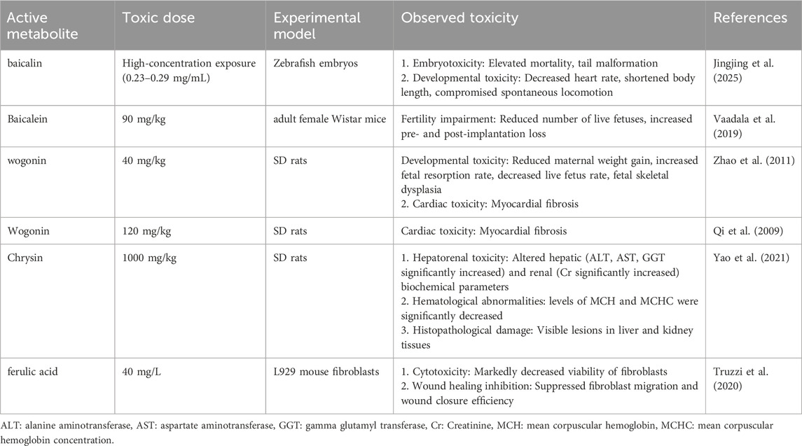While the long-term clinical use of SB in traditional Chinese medicine attests to its relative safety, modern toxicological studies reveal that some of its isolated polyphenolic metabolites can exhibit potential toxicity under specific conditions. These metabolites display a notable dose-dependent bidirectional effect: neuroprotective within the therapeutic window, yet toxic upon supra-threshold exposure (Table 2). For instance, Pudilan anti-inflammatory oral liquid, which contains baicalin as a primary active metabolite, demonstrated dose-dependent developmental toxicity in zebrafish embryos. High-concentration exposure (0.23–0.29 mg/mL) induced significant embryotoxicity, manifested as high mortality, specific malformations (particularly in the tail), and severe inhibition of embryonic viability and development. It also provoked multi-dimensional developmental toxicity, including reduced heart rate, shortened body length, and impaired spontaneous movement (Jingjing et al., 2025). Prenatal exposure to a high dose (90 mg/kg) of baicalein in female mice severely affected fertility, resulting in a reduced number of live fetuses and increased pre- and post-implantation loss (Vaadala et al., 2019). Administration of a high dose of wogonin (40 mg/kg, intravenous injection) induced developmental toxicity in pregnant rats and their fetuses, characterized by significantly suppressed maternal weight gain, increased absorption rate, decreased live fetus rate, and abnormal fetal skeletal development (Zhao et al., 2011). Furthermore, long-term high-dose wogonin (120 mg/kg, intravenous injection) caused cardiac injury in rats, including lesions such as myocardial fibrosis (Qi et al., 2009). The median lethal dose (LD50) of chrysin was determined to be 4350 mg/kg. After 90 days of oral administration at 1,000 mg/kg, rats exhibited toxic effects such as abnormal biochemical indices in the liver and kidneys, altered hematological parameters, and histopathological damage (Yao et al., 2021). In summary, baicalin, baicalein, wogonin, and chrysin demonstrate a higher propensity for inducing in vivo systemic toxicities, including developmental toxicity and organ damage. In contrast, ferulic acid’s toxicity was observed in vitro at a high concentration (40 mg/L), where it suppressed the viability of L929 fibroblasts and hindered wound healing (Truzzi et al., 2020; Talbott et al., 2022). A comparison of toxic dose thresholds reveals that chrysin has the highest in vivo toxicity threshold, whereas wogonin possesses the lowest. This indicates that the dose control of wogonin mandates prioritized attention during the clinical translation of SB polyphenols to prevent toxicity resulting from improper dosing. Furthermore, as these polyphenols are often intended for long-term management of chronic conditions, special populations such as pregnant and lactating women, who are more susceptible to drug toxicity, require precise definition of the therapeutic window to ensure clinical safety.