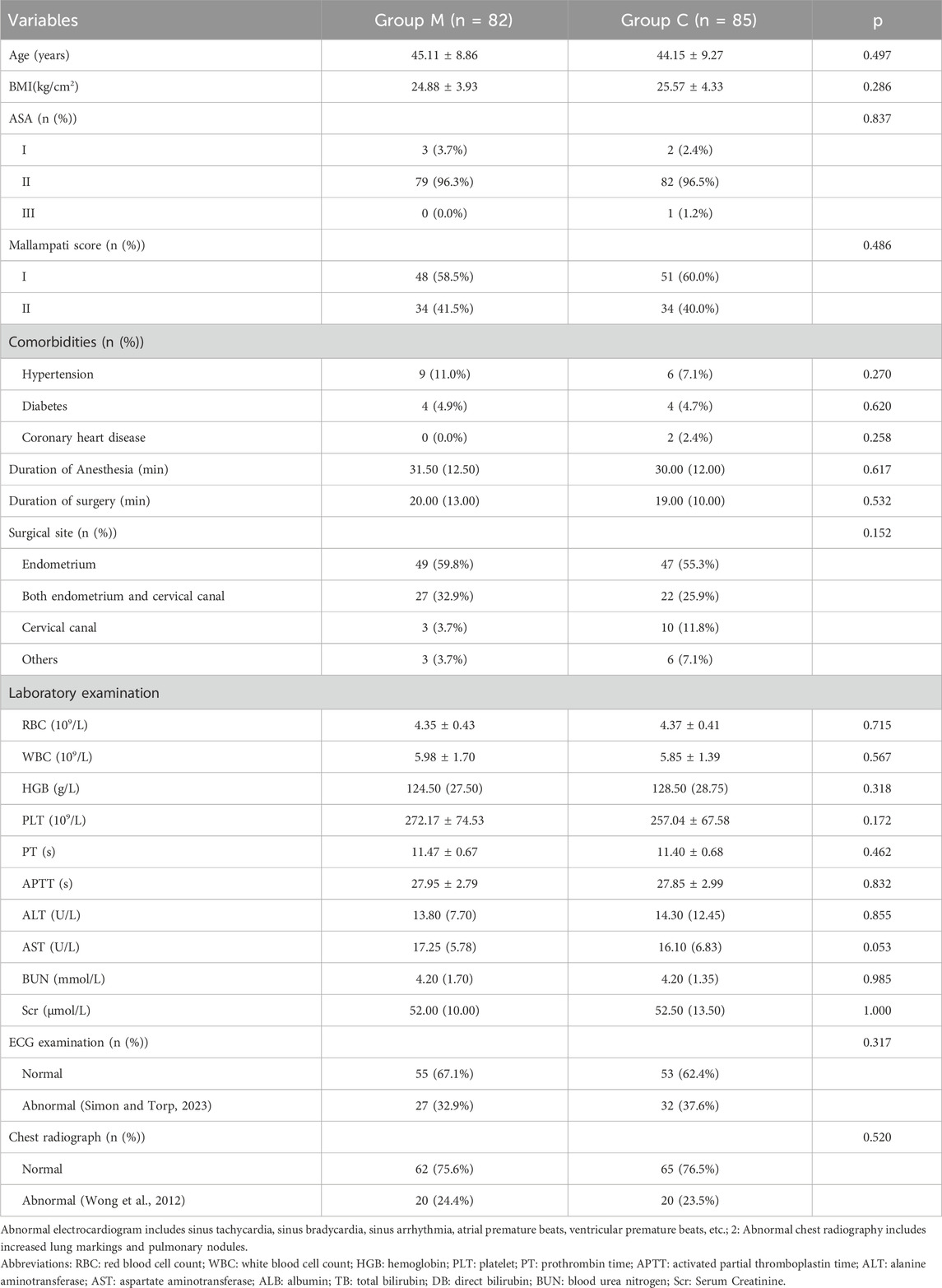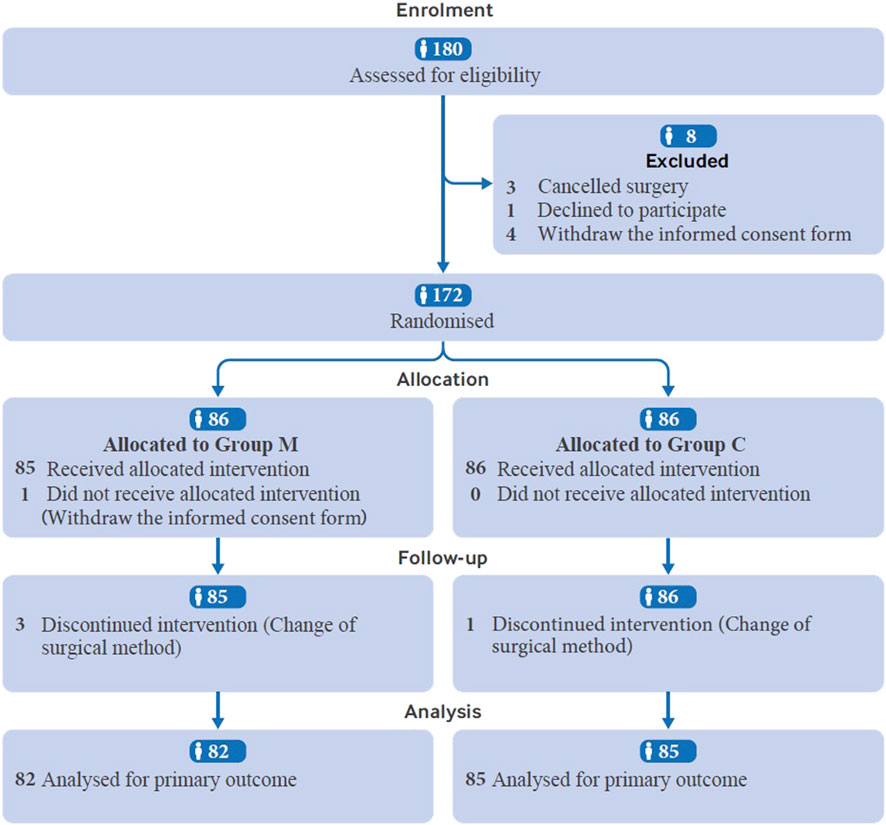 In total, 180 patients were assessed for eligibility. One patient declined to participate, four withdrew the informed consent form, and three were excluded for surgery cancellation. The remaining 172 patients were randomly assigned to different treatment groups. Four patients in group M were excluded from further analysis because of surgical method change (n = 3) and informed consent form withdrawal (n = 1), while one patient was excluded from group C because of surgical method change. Finally, 167 patients were analyzed, with 82 in Group M and 85 in Group C (Figure 1). The demographic characteristics of the patients, including age, body mass index (BMI), American Society of Anesthesiologists (ASA) physical status classification, Mallampati score, and preoperative examination findings were not significantly different between the two groups (Table 1).
