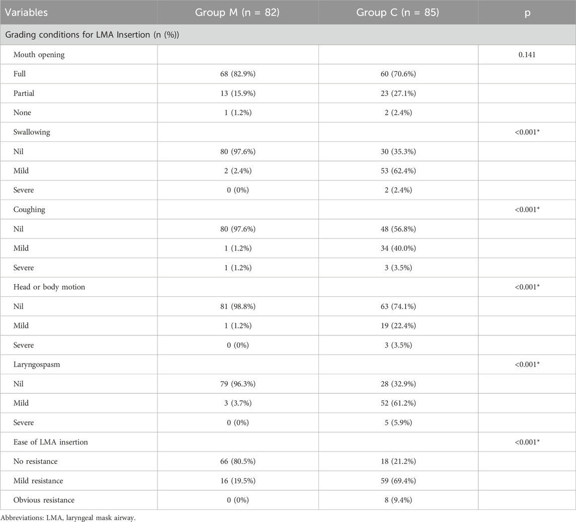 Meanwhile, our research indicates that patients in group M had a higher success rate in the first attempt of LMA insertion, required less additional propofol, and consumed less total time for insertion process. We have reason to believe that this is due to the improvement of the conditions for LMA insertion, where the patient’s pharyngeal muscles have better relaxation and less resistance. Other studies have also made similar findings. A study conducted in Turkey showed that improving the placement conditions of LMA can accelerate the speed of LMA placement and reduce the hemodynamic fluctuation (Çakır et al., 2025). Zheng et al.'s (Zheng et al., 2025) meta-analysis found that insertion of LMA using a laryngoscope-guided technique can improve fibrotic staging, oxidative lean pressure, and success rate for the first attempt of LMA insertion. Therefore, improving the implantation conditions during LMA implantation still has positive clinical significance. At present, although there are studies exploring the clinical effects of a single intervention, there is no standard operating procedure for improving LMA implantation conditions, or exploring whether combining multiple intervention methods can have a better effect on improving LMA implantation conditions. Therefore, further research is still necessary.