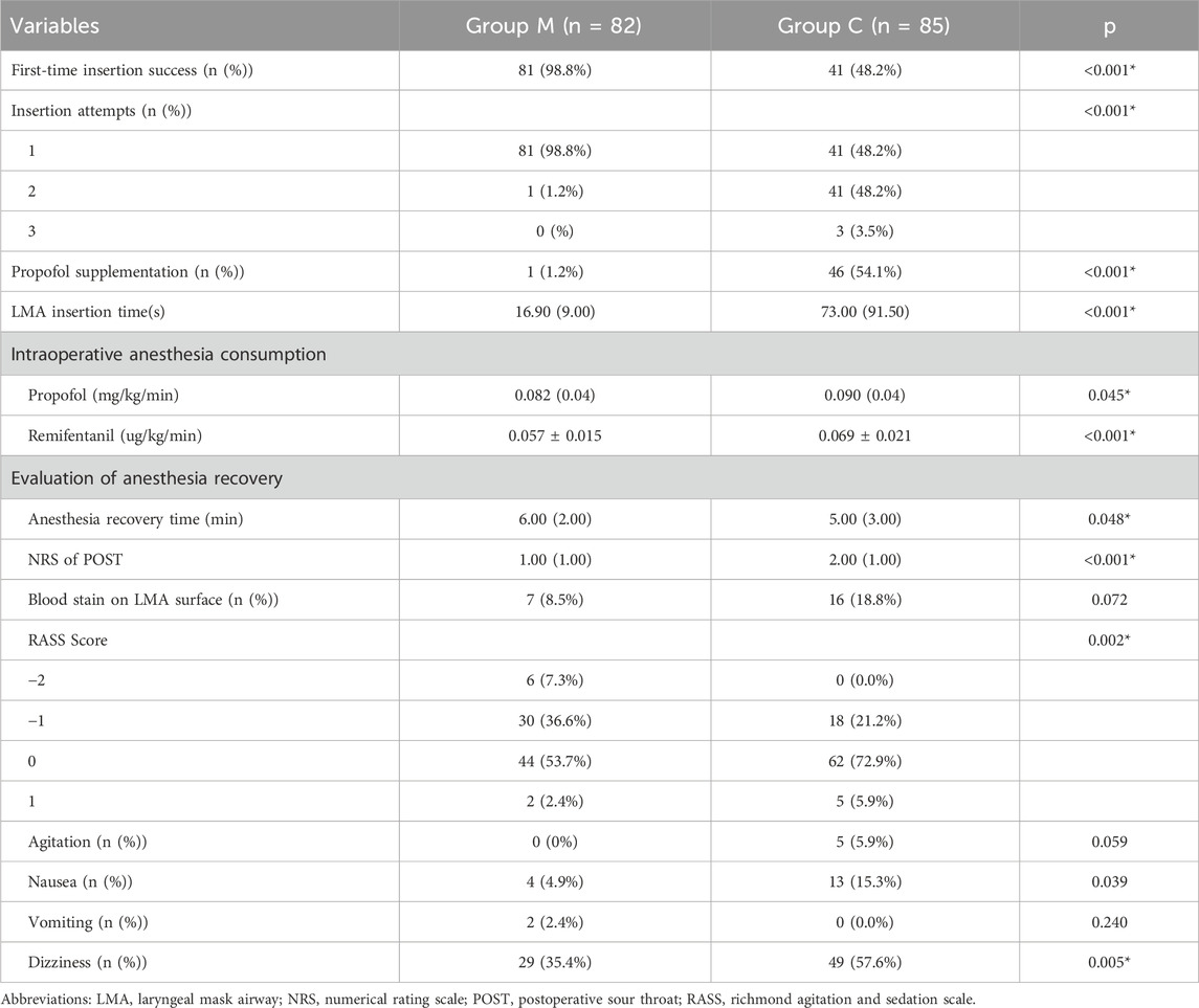 Secondary outcome measures: LMA insertion process: including whether the first attempt and final insertion was successful, the time of attempts, whether additional propofol was required during LMA insertion, the time required for LMA insertion, and parameters of respirator after LMA insertion (tidal volume, peak airway pressure, and plateau pressure); systolic blood pressure (SBP), diastolic blood pressure (DBP), mean blood pressure (MBP) and HR when entering the operating room (T1), after anesthesia induction (T2), after LMA insertion (T3), 5 min after LMA insertion (T4) and 10 min after LMA insertion (T5); whether the LMA was displaced and whether the patient had body movement during the operation; patient recovery evaluation: including anesthesia recovery time, whether there was blood stain on the surface of LMA, POST pain score of throat after LMA removal (using numerical rating scale (NRS), 0–10), Richmond agitation and sedation scale (RASS) (Sessler et al., 2002) after LMA removal, and dizziness, postoperative nausea and vomiting (PONV) (Gan et al., 2020), agitation in PACU.