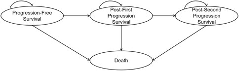 Estimates for PFS, PFS2, and OS were derived from the SONIA trial’s Kaplan-Meier curves. IPD were reconstructed using Guyot’s algorithm with Engauge Digitizer (version 4.1) (Guyot et al., 2012). The reconstructed IPD closely matched the original at-risk population and accurately reproduced the published survival curves. These IPD were used to fit a range of parametric and flexible survival models, including exponential, Weibull, Gompertz, gamma, log-logistic, log-normal, generalized gamma, fractional polynomial, restricted cubic spline, and Royston-Parmar spline models. Model selection was based on the Akaike information criterion (AIC) and visual assessment of fit, with lower AIC values and satisfactory visual concordance indicating a preferred model. Additional details on model selection and external validation are provided in Supplementary File S1 (Supplementary Table S3; Supplementary Figure S1). The four-state partitioned survival model was computed as follows: