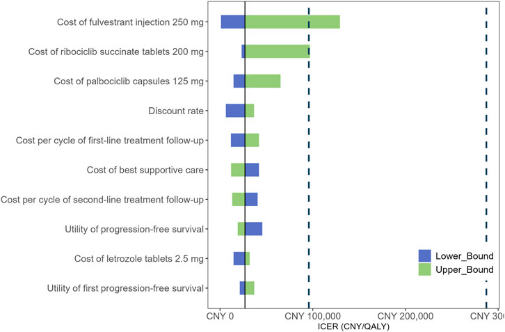 Figure 2. Tornado diagram shows the association of variables with the ICER of CDK4/6i-first group vs. CDK4/6i-second group. ICER, incremental cost-effectiveness ratio; QALY, quality-adjusted life year.