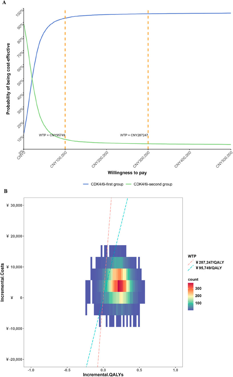 To our knowledge, this is the first China-based economic evaluation to compare first- versus second-line sequencing of CDK4/6 inhibitors using a whole-disease modeling framework anchored to the SONIA trial. In the context of China’s pricing and reimbursement environment, first-line CDK4/6 inhibition combined with endocrine therapy emerges as a cost-effective strategy and remains so at higher willingness-to-pay thresholds even when generic availability is considered.