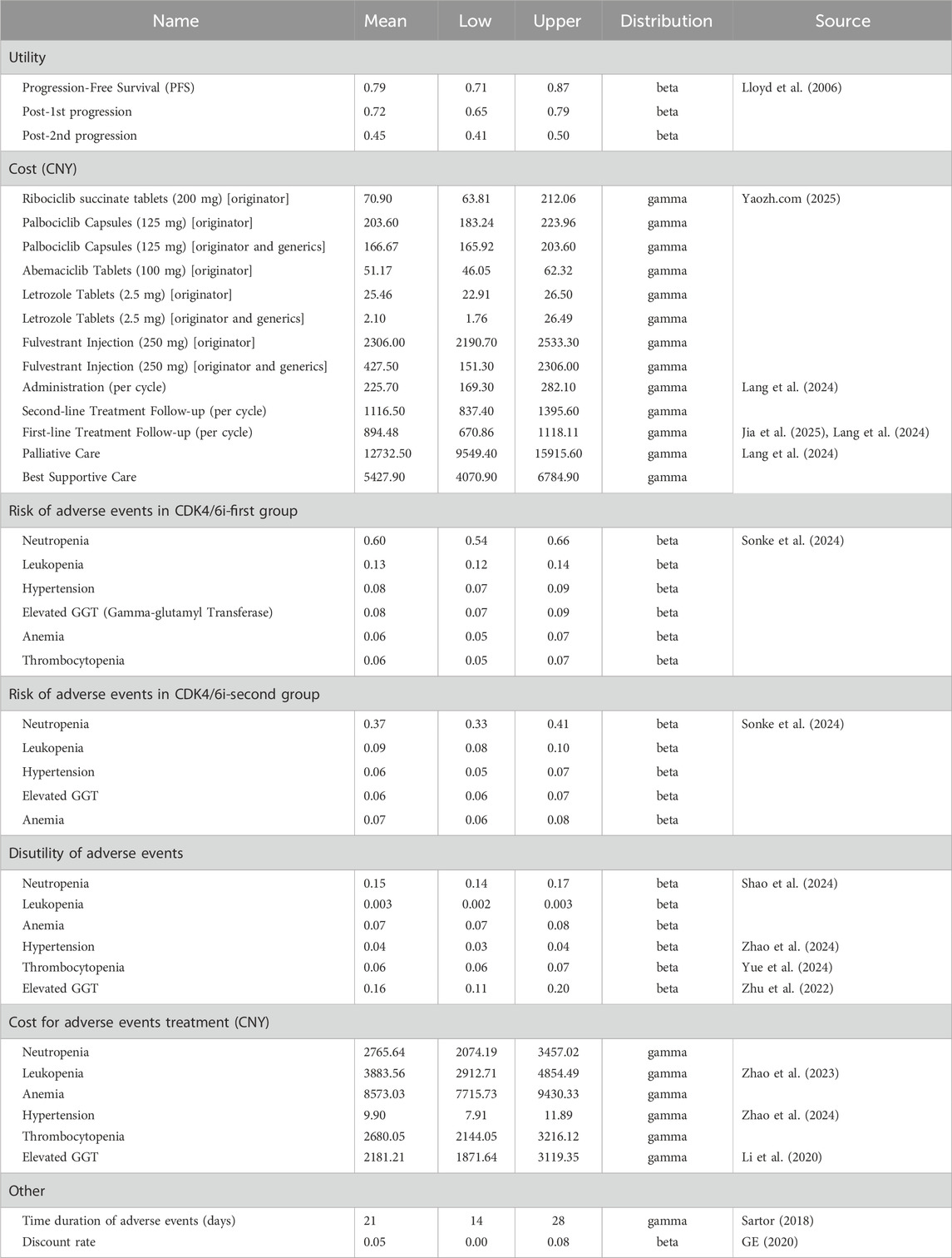 The economic model incorporated direct medical costs, including drug acquisition, routine follow-up, management of adverse events (AEs), best supportive care, and end-of-life care. Drug unit costs were primarily based on the median 2024 branded drug bidding prices across Chinese provinces, as reported on YAOZH (yaozh.com) (Yaozh.com, 2025). Scenario analyses also considered prices reflecting the availability of generic drugs. For both the intervention and control groups, drug costs were calculated as weighted averages based on the distribution of CDK4/6 inhibitor use among patients in the SONIA Baseline characteristics of patients (Supplementary Table S1). To simplify the analysis, only grade 3 or higher adverse events with an incidence greater than 5% were included; the costs and durations of these events were derived from published sources. All costs were adjusted for inflation to December 2024 using the Consumer Price Index Inflation Calculator (U.S. Bureau of Labor Statistics, 2025). Utility values were obtained from published literature, with disutilities from adverse events applied as negative adjustments. The key model input parameters are summarized in Table 1.