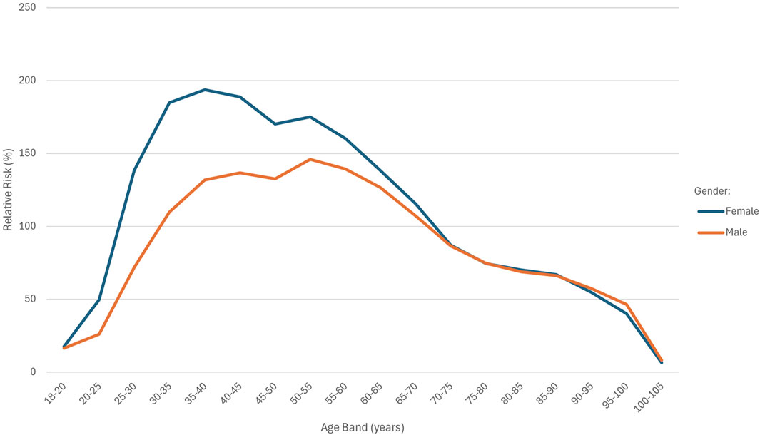 Line chart showing relative risk percentages by age band for males and females. The relative risk was consistently higher among females across all age bands below seventy years, with the greatest disparity observed around thirty-five. Above seventy years of age, relative risk values were almost identical between males and females.