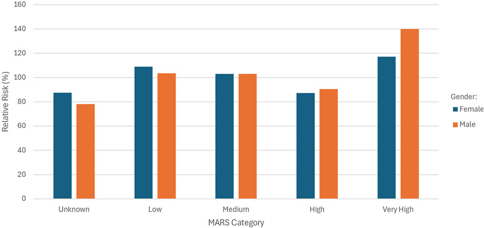 Bar chart showing relative risk percentages by MARS category for males and females. A higher relative risk was observed for females in the “unknown” and “low” MARS categories. In the “high” category, males showed a slightly elevated relative risk compared to females (90.42% vs. 87.22%), and a substantially higher relative risk in the “very high” category (139.88% males vs. 117.18% females).