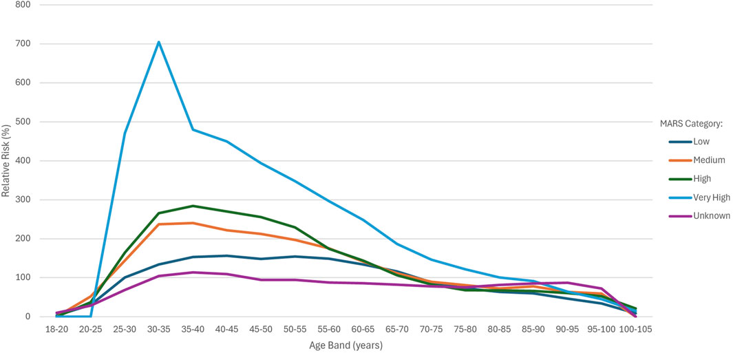 Line graph showing relative risk percentages by age group across five MARS categories: Low, Medium, High, Very High, and Unknown. There was differentiation of risk within the 25 to 55 age bands, with a higher MARS score indicating a higher actual-to-expected ratio and relative risk. The relative risk for the very high category was substantially higher than all other groups up until the 85 to 90 age band, with a spike observed in the 30 to 35 age band.