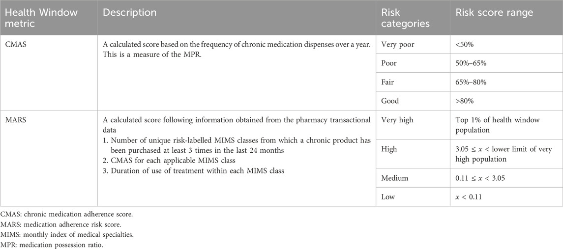 The Medication Adherence Risk Score (MARS) is a calculated score using pharmacy transactional data obtained from Health Window (a registered company specialising in managing chronic medication adherence). Electronic pharmacy records have been used to measure adherence in international studies (Sun et al., 2024; Amiesimaka et al., 2024; Galozy et al., 2020), and in some instances with a view to understand its relationship to mortality risk (Bailey et al., 2010; Fo et al., 2019; Wong et al., 2013). At the time of the study, Health Window partnered with pharmacies comprising roughly 50% of the private South African market. It received daily feeds of pharmacy transactional data in order to deliver the medication adherence service. This data was processed using various metrics, including a chronic medication adherence score (CMAS) and the MARS. The CMAS is a form of the widely recognised medication possession ratio, representing the proportion of doses dispensed out of doses prescribed, over a defined time period (Stauffer et al., 2017). The CMAS may have some inherent limitations in predicting mortality risk. The MARS considers the number of chronic diseases, the duration of treatment, and the variability in risk across different conditions, whereas the CMAS does not.