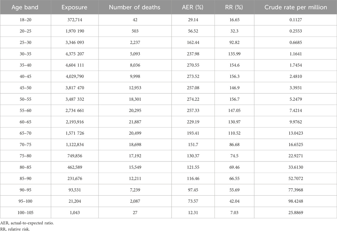 Exposure was relatively low in the 18–20 and 80–105 age bands, with the highest exposure in the 35–40 age band. The highest number of deaths occurred in the 60–65 age band. The AER values were below 100% in the 18–25 and 90–105 age bands, while AER exceeded 200% in the 30–65 age range. A RR of above 100% was observed in the 30 and 70-year age groups. The highest crude rate (98.4248) was recorded in the 95–100 age band.