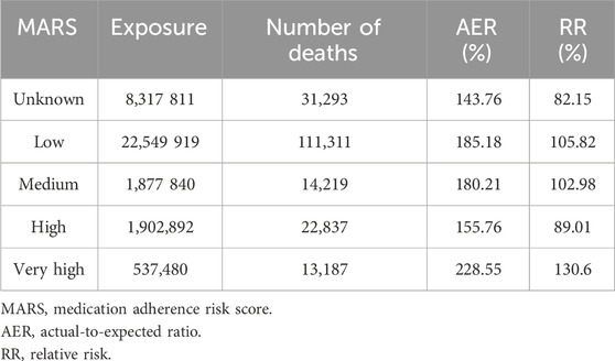 This study aimed to demonstrate that the MARS model can enhance risk stratification efforts by identifying individuals at increased risk of mortality related to non-adherence to chronic medication. The mortality experience of the study population was higher than the expected fully underwritten base (AER = 175%). The RR was greater than 100% in the 30 to 65 age bands for males and the 25 to 65 age bands for females. When considering the overall sample, increasing AER and RR did not correlate with increasing MARS categories. The very high MARS category had the lowest number of exposures (n = 527,480) and the highest AER (228.55%) and RR (130.6%). The low and medium groups had similar AERs (185.18% and 180.21%, respectively) and RRs (105.82% and 102.98%, respectively). The high group had the lowest AER (155.76%) and RR (89.01%) of known MARS categories. A similar trend in AER and RR across MARS categories was observed for both males and females. However, use of the MARS in addition to age band allowed for differentiation of risk within the 25 to 55 age bands, with a higher MARS score indicating a higher AER and RR.