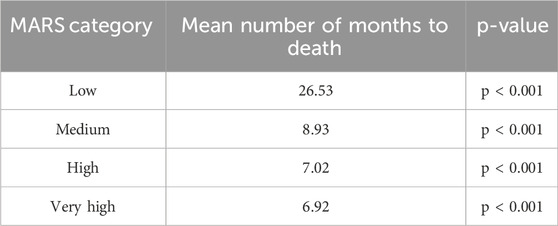 The time-to-event analysis showed a statistically significant difference (p < 0.001) in the mean number of months before death occurred between the different MARS categories (Table 4). The Schoenfeld plots indicated that the proportional hazards assumption was reasonably met.