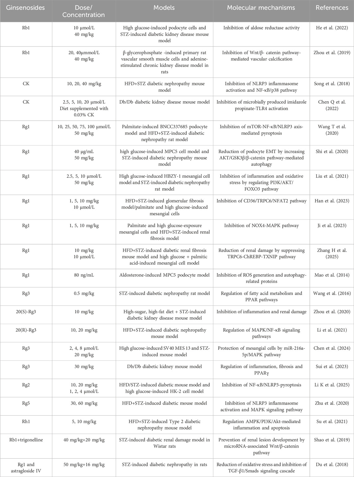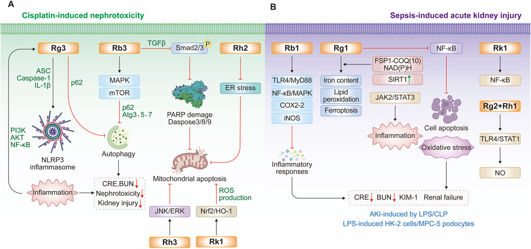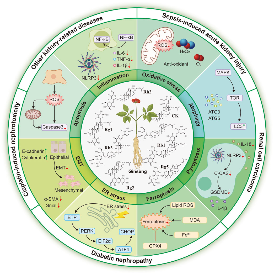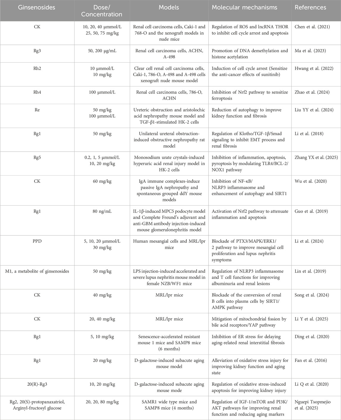 Following oral or intravenous administration, ginsenoside monomers such as Rb1, Rc, Rd, Rh3, Rg1, Rg2, and compound K (CK) are detectable in the plasma humans, rats or mice (Wang et al., 2011; Ma et al., 2015; Jeon et al., 2020). Tissue distribution studies show that ginsenoside Rg1 accumulates most abundantly in the kidney, particularly in the renal pelvis, compared to the liver, lung, or heart (Wei W. et al., 2021). Functionally, ginsenosides have demonstrated efficacy in preventing acute kidney injury induced by cisplatin- or lipopolysaccharide (LPS) (Wu et al., 2021; Guo et al., 2024; Ma et al., 2024; Wang L. et al., 2024), ameliorating diabetic nephropathy and fibrosis (He et al., 2022; Han et al., 2023; Ji et al., 2023; Li K. et al., 2025; Zhang H. et al., 2025), and inhibiting renal carcinoma progression (Hwang et al., 2022; Ma et al., 2023; Zhao et al., 2024) in cellular and animal models. These protective and anti-tumor effects are mediated through key biological pathways, including modulation of inflammatory responses, oxidative stress, apoptosis, and autophagy.