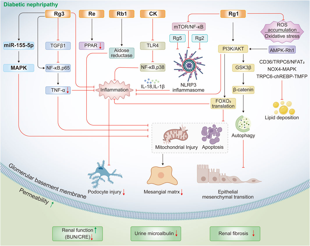 Ginsenosides have been evaluated in diverse animal models of diabetic kidney disease, including high-fat diet (HFD) and streptozotocin (STZ)-induced rodent models and Db/Db mice with leptin receptor mutations, to assess their protective effects against diabetic kidney disease (Chen et al., 2023; Fan et al., 2023). Ginsenoside Rb1 suppresses high glucose-induced cell death, mitochondrial injury, and diabetes-associated glomerular hypertrophy and mesangial expansion by binding to and inhibiting aldose reductase (He et al., 2022). In chronic kidney disease, vascular calcification characterized by calcium deposition and vascular smooth muscle cell osteogenic transdifferentiation, is attenuated by Rb1 via regulation of the PPARγ/Wnt/β-catenin axis in both chronic kidney disease-induced vascular calcification rats and β-glycerophosphate-stimulated vascular smooth muscle cells (Zhou et al., 2019). Another major metabolite, CK, prevents HFD/STZ-induced diabetic nephropathy and high glucose-mediated mesangial cell damage by inhibiting NLRP3 inflammasome activation and the NF-κB/p38 pathway (Song et al., 2018). Furthermore, 16-week CK supplementation remodels the gut microbiota, reducing the level of its metabolite imidazole propionate, thereby downregulating TLR4 signaling and improving renal morphology and microalbuminuria (Chen Q. et al., 2022).