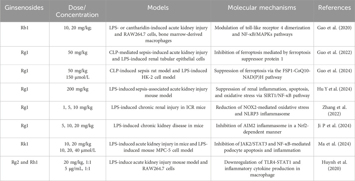 Ginsenosides have emerged as promising interventions against LPS- or CLP-induced acute kidney injury, primarily by suppressing renal inflammation, podocyte apoptosis, and ferroptosis (Gao et al., 2020; Guo et al., 2022; Hu Y. et al., 2024). Ginsenoside Rb1 reduces septic mortality in mice challenged with LPS or cantharidin by inhibiting proinflammatory cytokine release, COX-2 and inducible nitric oxide synthase levels in LPS-stimulated RAW264.7 cells and bone marrow-derived macrophages, through modulation of TLR4/MyD88 and NF-κB/MAPK pathways (Gao et al., 2020). Likewise, ginsenoside Rg1 protects against sepsis-induced acute kidney injury in both cellular and animal models (Guo et al., 2022; Guo et al., 2024; Hu Y. et al., 2024). In CLP rats and LPS-stimulated HK-2 cells, Rg1 decreases serum creatinine, blood urea nitrogen, kidney injury molecule-1 (KIM-1), and neutrophil gelatinase-associated lipocalin (NGAL) levels, while reducing iron accumulation, lipid peroxidation, and ferroptosis (Guo et al., 2022). Mechanistically, Rg1 suppresses renal tubular epithelial ferroptosis via the ferroptosis suppressor protein 1–CoQ10–NAD(P)H pathway (Guo et al., 2024). Additionally, the protective role of Rg1 involves in enhancing SIRT1 activity to inhibit NF-κB signaling, thereby reducing apoptosis, oxidative stress, and inflammation in septic kidneys (Hu Y. et al., 2024). Beyond acute injury, Rg1 also protects against low-dose LPS-induced chronic renal injury and fibrosis by inhibiting NOX4 and the NLRP3 inflammasome (Zhang et al., 2022) or through Nrf2-mediated suppression of AIM2 inflammasome activation (Ji P. M. et al., 2024). Ginsenoside Rk1 provides further renoprotection by blocking NF-κB and JAK2/STAT3 signaling in LPS-induced murine and podocyte injury models (Ma et al., 2024). Moreover, a combination of minor ginsenosides Rg2 and Rh1 exerts synergistic anti-inflammatory effects by targeting macrophages and suppressing TLR4/STAT1-dependent cytokine and NO production (Huynh et al., 2020). Collectively, ginsenosides Rg1, Rb1, and Rk1 confer multi-faceted renoprotection against sepsis-induced acute kidney injury through multiple mechanisms, including TLR4, NF-κB, NLRP3, STAT1/3, and ferroptosis-associated pathways (Table 2; Figure 1B).
