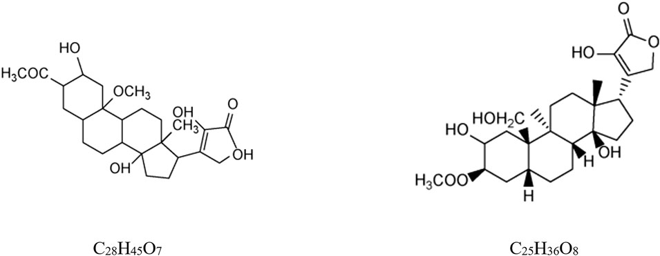 To date, two specific cardiac glycosides with lactone alcohol structures have been identified from Scorpio: 2β-,22-dihydroxy,3-acetoxyl,20-methoxy-cardenolidol (C28H45O7) (Gao, 2012) and 3β-acetoxyl,2,14,22-trihydroxy,19-hydroxymethyl,9a,5β,14β-card-20 (22)enolide (C25H36O8) (showed in Figure 1) (Gao et al., 2014).