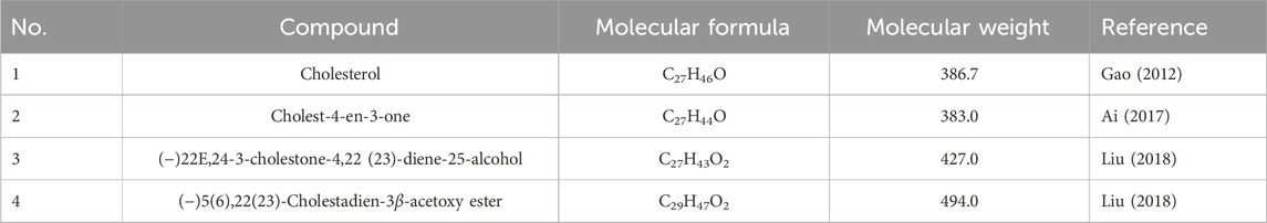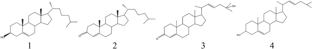 The initial identification of cholesterol in B. martensii scorpion was reported in 2012 (Gao, 2012). Subsequent phytochemical investigations have led to the isolation and characterization of four distinct sterol compounds from B. martensii, whose detailed chemical structures are systematically presented in Table 3 and Figure 2.