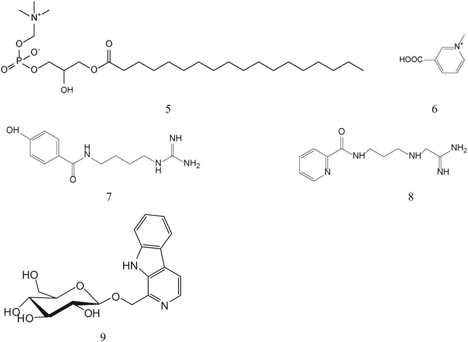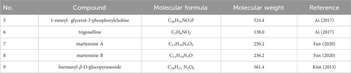 Pharmacological studies have demonstrated that scorpion-derived alkaloids exhibit a broad spectrum of bioactivities, including antimicrobial, antitumor, anti-aging, hypoglycemic, hypolipidemic, neuroprotective, and cognitive-enhancing properties (Kamble and Bodhankar, 2013; Pravalika et al., 2018; Zeng et al., 2021). Notably, martensine A and martensine B have shown remarkable propidium iodide substitution capacity, suggesting their potential therapeutic application in Alzheimer’s disease treatment (Fan, 2020). Furthermore, the isolation of harmanyl-β-D-glucopyranoside, a novel β-carboline glucopyranoside from B. martensii, has revealed significant hypoglycemic activity, highlighting the therapeutic potential of scorpion alkaloids in diabetes management.