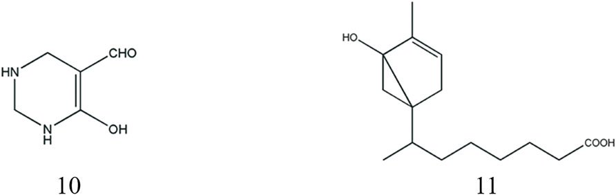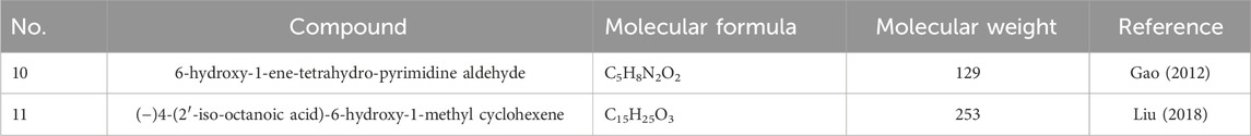 In 2012, a groundbreaking discovery revealed the presence of a unique nitro aldehyde structure in scorpions, specifically identified as 6-hydroxy-1-ene-tetrahydro-pyrimidine aldehyde, representing a hydroxyl-containing alkanal (Gao, 2012). Terpenoids, characterized by their structural composition of two or more isoprene units, were further investigated in scorpions. Notably (−)4-(2′-iso-octanoic acid)-6-hydroxy-1-methyl cyclohexene, a carboxyl-containing terpene, was first isolated from scorpions in 2018 (Liu, 2018). The structural details are presented in Table 5; Figure 4. Through advanced analytical techniques, researchers have employed headspace solid-phase microextraction (HS-SPME) coupled with gas chromatography-mass spectrometry (GC-MS) to comprehensively profile the volatile components of scorpions. A total of 43 components were separated and 42 components were identified, including aldehydes and ketones (11 species), terpenoids (8 species), and aromatics (4 species). The main chemical constituents are benzaldehyde (19.03%), phenol (13.22%), 2-pentylfuran (7.42%) and cubeba olefine (7.31%) (Zhou et al., 2018). In order to remove the fishy smell, doctors in past dynasties fried scorpion and glutinous rice together or prepared them with vinegar to absorb and mask the unpleasant odor-causing substances (Du et al., 2024).