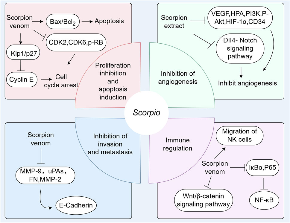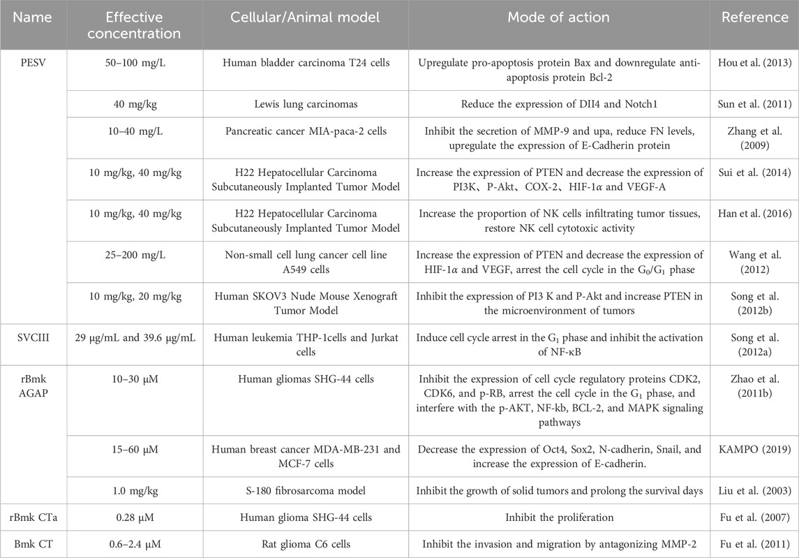 It has been found that scorpion venom polypeptides can inhibit the proliferation of many cancer cell lines. The main mechanisms are to induce cancer cell apoptosis, cell cycle arrest, inhibition of angiogenesis, invasion and migration, and immune regulation. Vascular endothelial growth factor (VEGF), epidermal growth factor receptor (EGFR), and basic fibroblast growth factor (bFGF) are highly expressed in various tumors and are considered important signal transducers in angiogenesis, involving the MAPK (Mitogen-Activated Protein Kinase), PI3K (Phosphoinositide 3-kinase)/Akt, and other signaling pathways (Sui et al., 2014). Many research results suggest that scorpion extract can inhibit the expression of VEGF, HPA, PI3K, P-Akt, HIF-1α, and CD34 in the microenvironment of liver cancer, thereby inhibiting angiogenesis (Wang et al., 2010b; Sui et al., 2014). The invasion and metastasis of tumor cells constitute one of the primary factors contributing to disease progression and deterioration. Currently, numerous studies focus on processes such as epithelial-mesenchymal transition (EMT) and the matrix metalloproteinase family (MMPs). Following EMT, epithelial cells undergo a series of cellular transformations ultimately resulting in basement membrane degradation and extracellular matrix remodeling (Patrick Henriet and Hervé Emonard, 2019). The MMP family is extensive and capable of degrading various types of collagen and adhesion proteins, thereby playing a crucial role in tumor cell adhesion, invasion, and migration (Patrick Henriet and Hervé Emonard, 2019). Tumor cells evade immune recognition and attack through complex mechanisms, allowing unchecked growth. Blocking this immune escape and remobilizing the immune system is a key anti-tumor strategy (Uzhachenko et al., 2025).