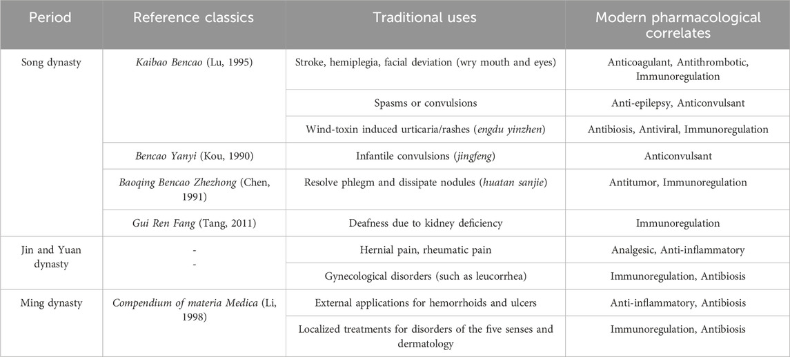The use of Scorpio in Chinese Traditional Medicine has a long history and is recorded in multiple classical Chinese medical texts. Scorpio was first documented as a medicinal substance in the Shu Bencao, although its efficacy and indications were not detailed therein (Ma, 2019). During the Song Dynasty, Kaibao Bencao began to document the therapeutic uses of Scorpio (Lu, 1995). Subsequent medical works in other historical periods successively added new records of its applications. It was not until the Qing Dynasty that a summary of its traditional uses was compiled, including dissipating blood heat, eliminating wind-dampness, resolving sores and ulcers, and serving as a channel-guiding agent (Ma, 2019). The traditional uses and initial documentation period of Scorpio are summarized in Table 1.