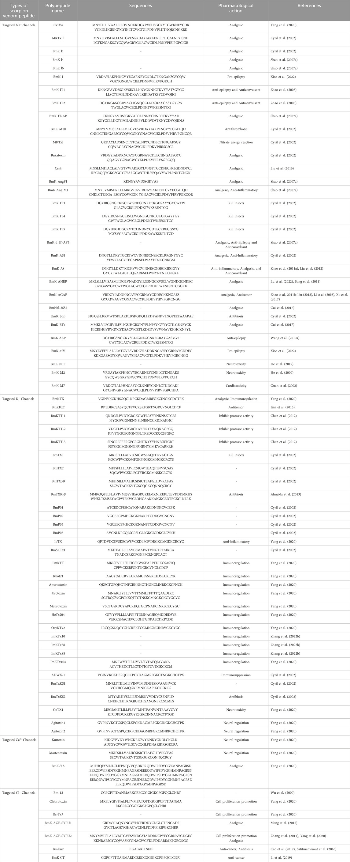 According to the bond connections, scorpion toxins can be divided into disulfide-bridged peptides (DBPs) and non-disulfide-bridged peptides (NDBPs) (Almaaytah and Albalas, 2014; Rincón-Cortés et al., 2019). The main function of disulfide bonds in DBPs is to maintain the stability of scorpion toxins and exhibit various neurotoxic and cytotoxic effects (Zhang and Wang, 2007). With the in-depth study, it has been found that they can specifically act on ion channels (Na+, K+, Ca2+, Cl−) on the membrane to play antibacterial, anticancer, anti-inflammatory, and immunomodulatory roles (Cyril et al., 2002; Almaaytah and Albalas, 2014). NDBPs have pharmacological effects such as antibacterial, bradykinin enhancement, hemolysis, and immunomodulation (Vega et al., 2010). Information on the types and pharmacological effects of scorpion venom peptides is shown in Table 2.