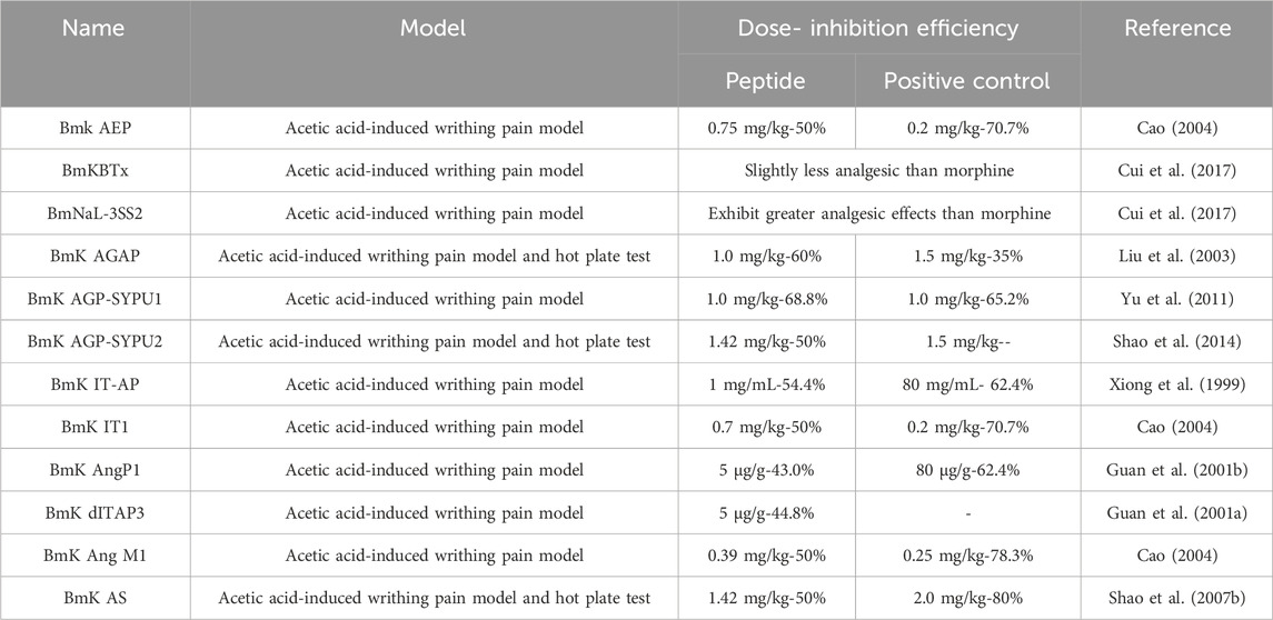 Studies have shown that using the whole body or tails of Scorpio in the treatment of somatic pain, visceral pain, neuralgia, and cancerous pain yields good therapeutic effects (Liu and Ma, 1993). The hot plate tail-flick test and acetic acid-induced writhing test were used to detect the analgesic effects of scorpion bodies and tails, respectively, and the results indicated that both exhibit significant analgesic effects (Liu and Ma, 1993). Scorpio can exert an analgesic effect on rats with bone cancer pain by inhibiting bone destruction and suppressing the activation of spinal astrocytes and microglia (Yu et al., 2020).Since analgesia is the main pharmacological effect of Scorpio, in recent years, many scholars have been committed to isolating and purifying single-component analgesic active peptides from scorpion venom, the main active component of Scorpio. The comparison between the peptides with analgesic activity and the positive control drug is summarized in Table 7.