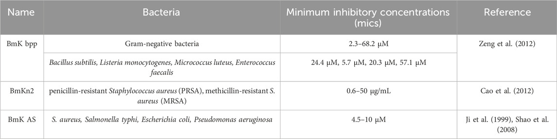 Scorpio exhibits broad-spectrum antibacterial activity and exerts a certain inhibitory effect on both Gram-positive and Gram-negative bacteria, primarily mediated by bioactive components including peptides, steroids, and quinones. Peptides with antibacterial activity are summarized in Table 8, including BmK bpp, BmKn2, and BmK AS. Mechanistic studies reveal that BmKn2 rapidly lyses Staphylococcus aureus by binding to lipoteichoic acid (LTA) on the bacterial surface, disrupting membrane integrity, and degrading the cell wall (Cao et al., 2012).