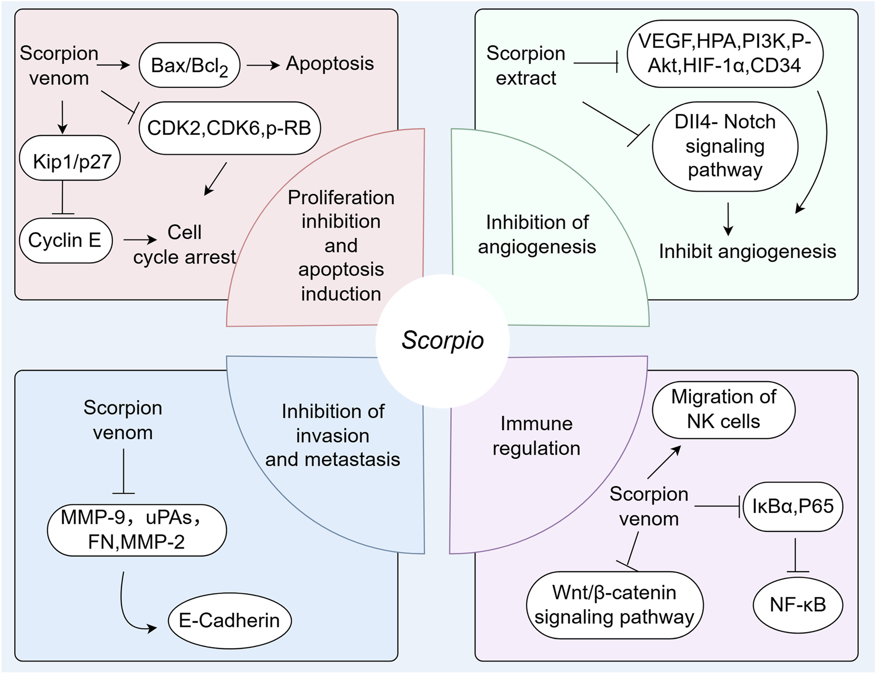 Processed scorpion Buthus martensii Karsch is a traditional animal-based medicine in Asia. The conventional processing method for scorpion medicinal material involves boiling live scorpions in salt water until their bodies become stiff, after which they are shade-dried (Commission, 2025). In this review, Scorpio refers to the dried body of the processed B. martensii scorpion. According to many ancient medical books in China, Scorpio has a medicinal history of more than 1,000 years (Zhang et al., 2024). The earliest record of Scorpio can be traced back to “Shu Bencao” (AD 935–960). Subsequent works, such as “Kaibao Bencao” (AD 973–974), “Bencao Tujing” (AD 1061), “Compendium of Materia Medica” (AD 1552–1,578) and “Benjing Fengyuan” (AD 1695), further recorded the medicinal properties (Zhang et al., 2024). There are 2,119 prescriptions containing Scorpio in the Dictionary of Traditional Chinese Medicine Formulas, and 34 kinds of preparations containing Scorpio are also included in the Chinese Pharmacopoeia (2025), such as Dianxianping tablets, Kangshuan Zaizao pills, and Tongbi capsules, which suggests a medicinal effect in treating stroke, epilepsy, rheumatism, hernia, chancre, and tetanus (Ma, 2019; Commission, 2025). South Korea, India, and countries in Africa also widely use Scorpio as a medicinal material (Yang et al., 2020). In modern medicine, Scorpio has also been used to treat gastric cancer, liver cancer, prostate cancer, and other tumors, as well as skin diseases and bronchial asthma (Shi and Guo, 2023), far exceeding the curative effects recorded in the Pharmacopoeia, which is closely related to advances in modern pharmacological research. Research indicates that Scorpio exhibits significant pharmacological effects including antitumor, antiepileptic, anticonvulsant, anticoagulant, and antibacterial properties (Wali et al., 2019). Additionally, they possess various biological activities such as analgesic and anti-inflammatory effects, growth promotion, and immune enhancement (Yang et al., 2020; Liu et al., 2021a). It is hypothesized that their pharmacological activities are primarily attributed to bioactive components like scorpion venom, steroidal derivatives, and alkaloids (Yang et al., 2020). Furthermore, in regions like Shandong and Henan Provinces, Scorpio is regarded as exceptional delicacy served at banquets, demonstrating high culinary value (Yang et al., 2020). This edible significance correlates with their rich nutritional composition containing amino acids, peptides, lipids, calcium, magnesium, and abundant trace elements (Song et al., 2024). It was found that Scorpio not only has obvious pharmacological effects, but also causes many adverse reactions such as abnormal liver function, cardiovascular system reactions, kidney injury, gastrointestinal reactions, and neurotoxic reactions (Yang et al., 2020). To mitigate its associated toxicity beyond dosage control, various processing methods–including boiling, mint-processing, licorice rinsing, and wine washing–are employed to reduce toxicity while enhancing therapeutic efficacy (Zhang et al., 2024). Nevertheless, the precise mechanisms underlying these effects remain poorly understood. At present, researchers have accumulated a large amount of research results on the chemical composition, pharmacological action, and toxicity of Scorpio. Based on this, this paper summarizes the above aspects in order to provide important reference materials for the in-depth application and development of Scorpio.