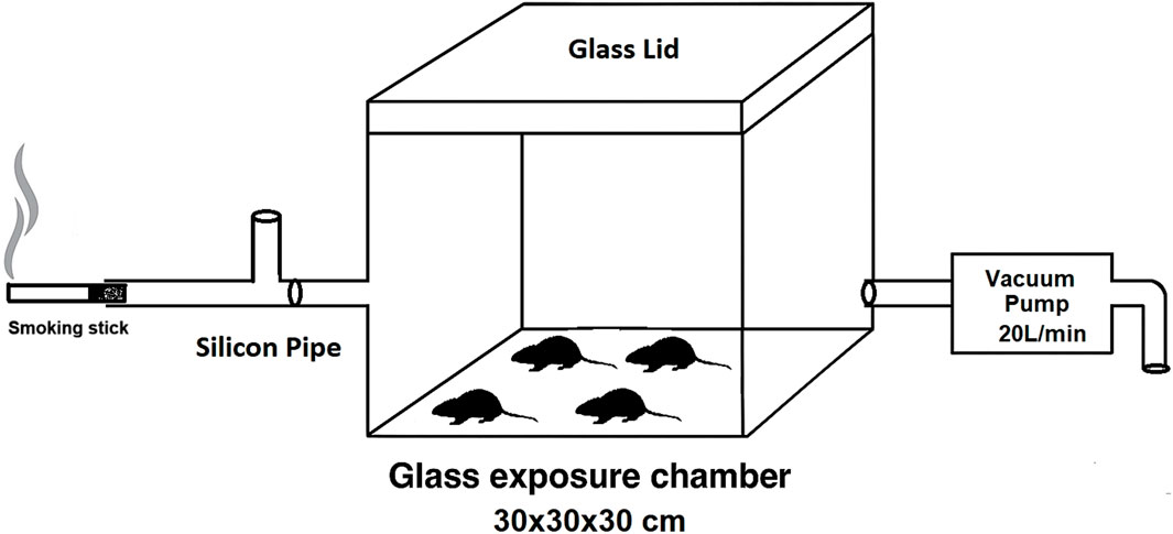 The main elements in our whole-body exposure system include a T-tube, a vacuum pump, and an exposure chamber (Figure 1). Compelled by the vacuum pump, the emissions or smoke moves uni-directionally from the T-tube to the exit valve. The smoking stick burns outside the exposure chamber in a glass T-tube, which allows mixing between air and flames, thus keeping the stick heating/burning. A stick takes ∼4 min to burn completely using a vacuum pump maintained at a flow rate of 20 L/min. The T-tube is connected to the exposure chamber via a silicone tube (5 mm × 40 mm). The exposure chamber is made up of glass (30 cm × 30 cm × 30 cm) and has a glass lid. During experimentation, the lid was sealed with silicone sealant to prevent air leakage from the exposure chamber. The vacuum pump is connected to the exposure chamber via a silicone tube (5 mm × 80 mm) and syringe filter (0.22 µ). The emissions/smoke exits from the other end of the vacuum pump into the water through a silicone tube. Four rats were simultaneously exposed to emissions or smoke, and the exposure was whole-body. Two tobacco sticks per day, one in the morning and one in the evening, were used daily for 60 days. The total exposure time per day was 8 min. The exposure method was modified from the previous report (Dos Reis et al., 2022). All the experiments were conducted in a controlled temperature of 25 °C ± 2 °C and relative humidity of 50% ± 5%, which was maintained by an air conditioner.