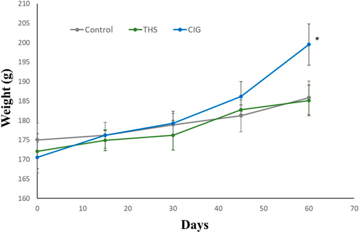 Figure 2. Time-course plot of change in body weight from baseline to day 60 in control and exposed rats. CIG vs. control, p < 0.05; CIG vs. THS, p < 0.05 (at day 60).