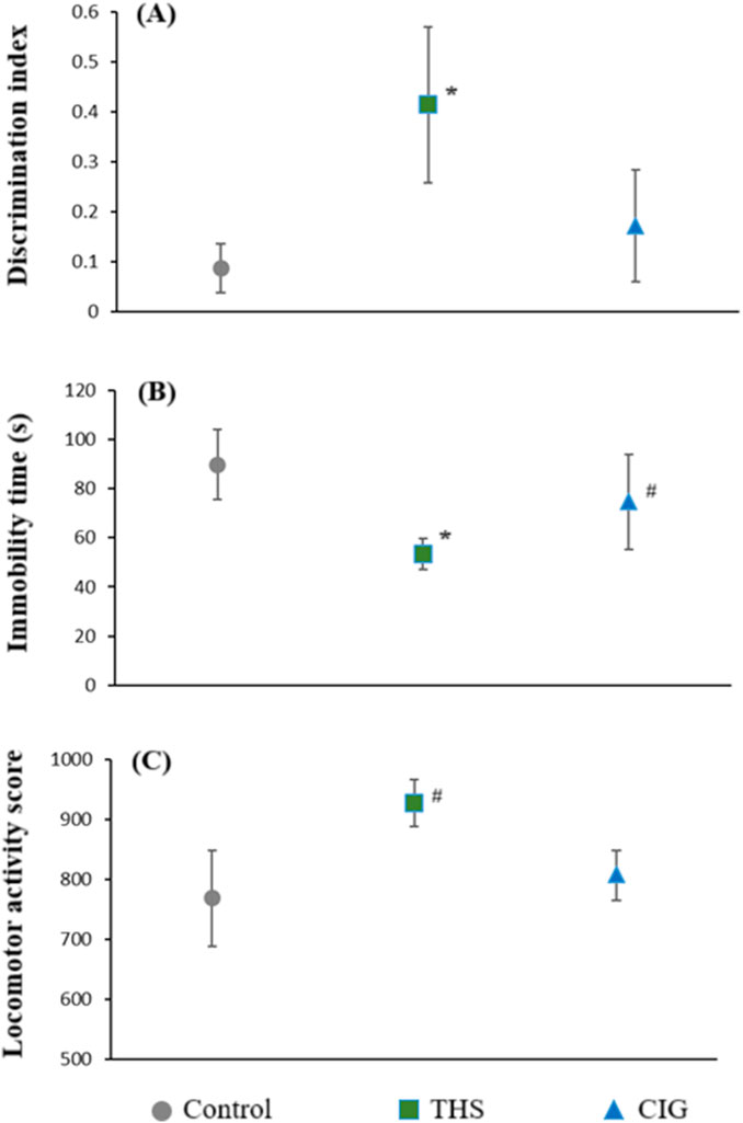To obviate the possibility that improvements observed in the NORT and FST were confounded by altered locomotor activity, we conducted an actophotometer test prior to behavioral assessments. An increased activity score was presumed as an index of CNS stimulation (Becker et al., 2023). It is important to note that the THS-exposed group exhibited a statistically significant increase in locomotor activity compared with both the control and CIG groups (p < 0.01 and p < 0.05, respectively). Although this elevation was interpreted as indicative of mild CNS arousal, it cannot be entirely excluded that the enhanced locomotion may have contributed to the apparent improvements in exploratory and mobility-dependent behavioral tasks such as the NORT and FST. Therefore, the observed cognitive and antidepressant-like effects should be interpreted with caution, acknowledging the possibility of partial locomotor influence on behavioral performance.