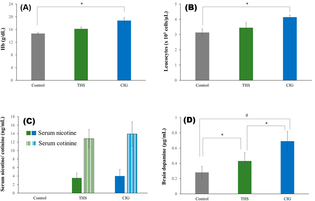 Figure 4. Biochemical levels of the control and exposed rats’ (A) Hb, (B) leukocyte count, (C) serum nicotine and cotinine, and (D) brain dopamine. *p < 0.05; #p < 0.001.