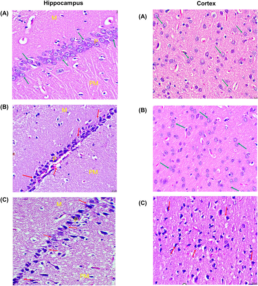 Figure 5. Histopathology images of the hippocampus and cortex region of the brain of the (A) control, (B) THS, and (C) CIG group rats. (H&E, 100x, 50 µm). Hippocampus histopathology images showed molecular (M), pyramidal (P), and polymorphic (Po) layers. The glial cells and capillaries are scattered inside molecular and polymorphic layers. Cortex histopathology showed astrocytes and neurons.