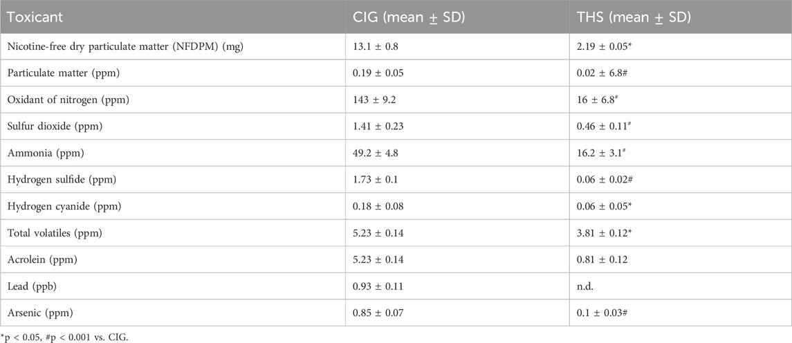 THS emissions showed significantly lower toxicant levels than CIG smoke (Table 2). NFDPM was ∼6-fold lower; particulate matter was ∼10-fold lower; and nitrogen/sulfur oxides, ammonia, hydrogen sulfide, hydrogen cyanide, and arsenic were significantly reduced (p < 0.001). Notably, lead traces were detected in CIG smoke but not in THS emissions. Similar observations were reported previously when toxicants in CIG smoke and THS emissions were compared (Sood et al., 2024).