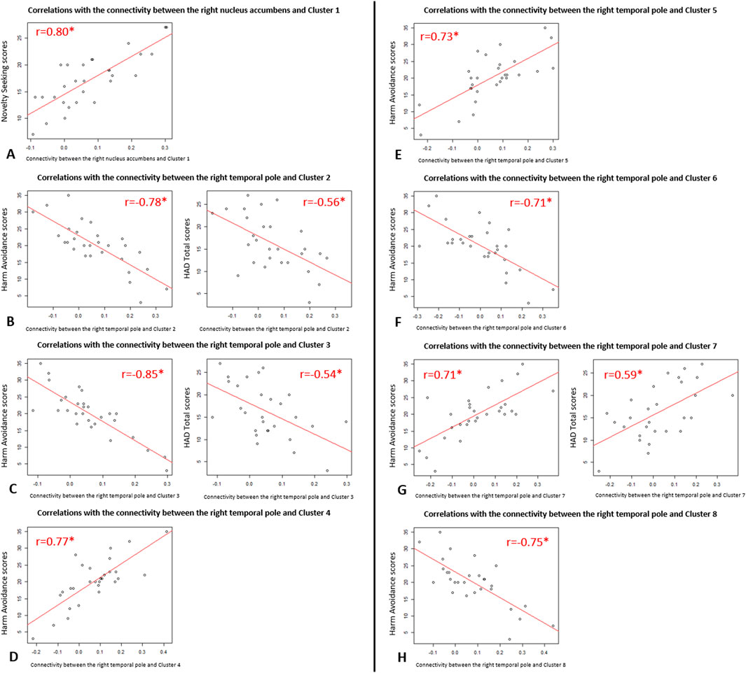 Figure 2. Scatter plots of the significant correlations between functional connectivity and clinical variables in Parkinson’s disease patients. Representations of the correlations of Pearson from Table 2: (A) Correlations between the functional connectivity of “the right nucleus accumbens and Cluster 1” and Novelty Seeking scores; (B) Correlations between the functional connectivity of “the right temporal pole and Cluster 2” and Harm Avoidance scores (on the left) and HAD Total scores (on the right); (C) Correlations between the functional connectivity of “the right temporal pole and Cluster 3” and Harm Avoidance scores (on the left) and HAD Total scores (on the right); (D) Correlations between the functional connectivity of “the right temporal pole and Cluster 4” and Harm Avoidance scores; (E) Correlations between the functional connectivity of “the right temporal pole and Cluster 5” and Harm Avoidance scores; (F) Correlations between the functional connectivity of “the right temporal pole and Cluster 6” and Harm Avoidance scores; (G) Correlations between the functional connectivity of “the right temporal pole and Cluster 7” and Harm Avoidance scores (on the left) and HAD Total scores (on the right); (H) Correlations between the functional connectivity of “the right temporal pole and Cluster 8” and Harm Avoidance scores.