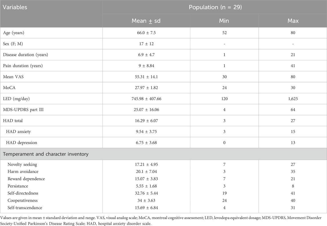 Demographical and clinical data (gender, age, disease duration, levodopa equivalent dosage (LED) (Tomlinson et al., 2010) etc.) were collected. Anxio-depressive state was measured with the Hospital Anxiety and Depression scale (HAD), and personality dimensions were assessed with the TCI. The TCI is an auto-evaluation formed of 226 True or False questions, which results in seven personality dimensions scores (Cloninger et al., 1994). Then, resting-state functional magnetic resonance imaging (rs-fMRI) evaluated brain functional connectivity. Patients were under their usual dopaminergic treatment throughout the whole protocol.