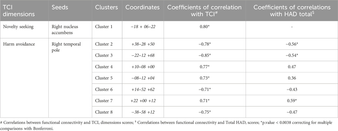 Results: Significant association was found between Novelty Seeking scores and functional connectivity within the nucleus accumbens and one cluster formed of the orbitofrontal cortex. Significant associations were also found between Harm Avoidance scores and functional connectivity within the temporal pole and seven clusters (mainly formed of the post- and pre-central gyri, thalami, parietal lobule, putamen and temporal gyrus). These functional connectivities also correlated with HAD scores.