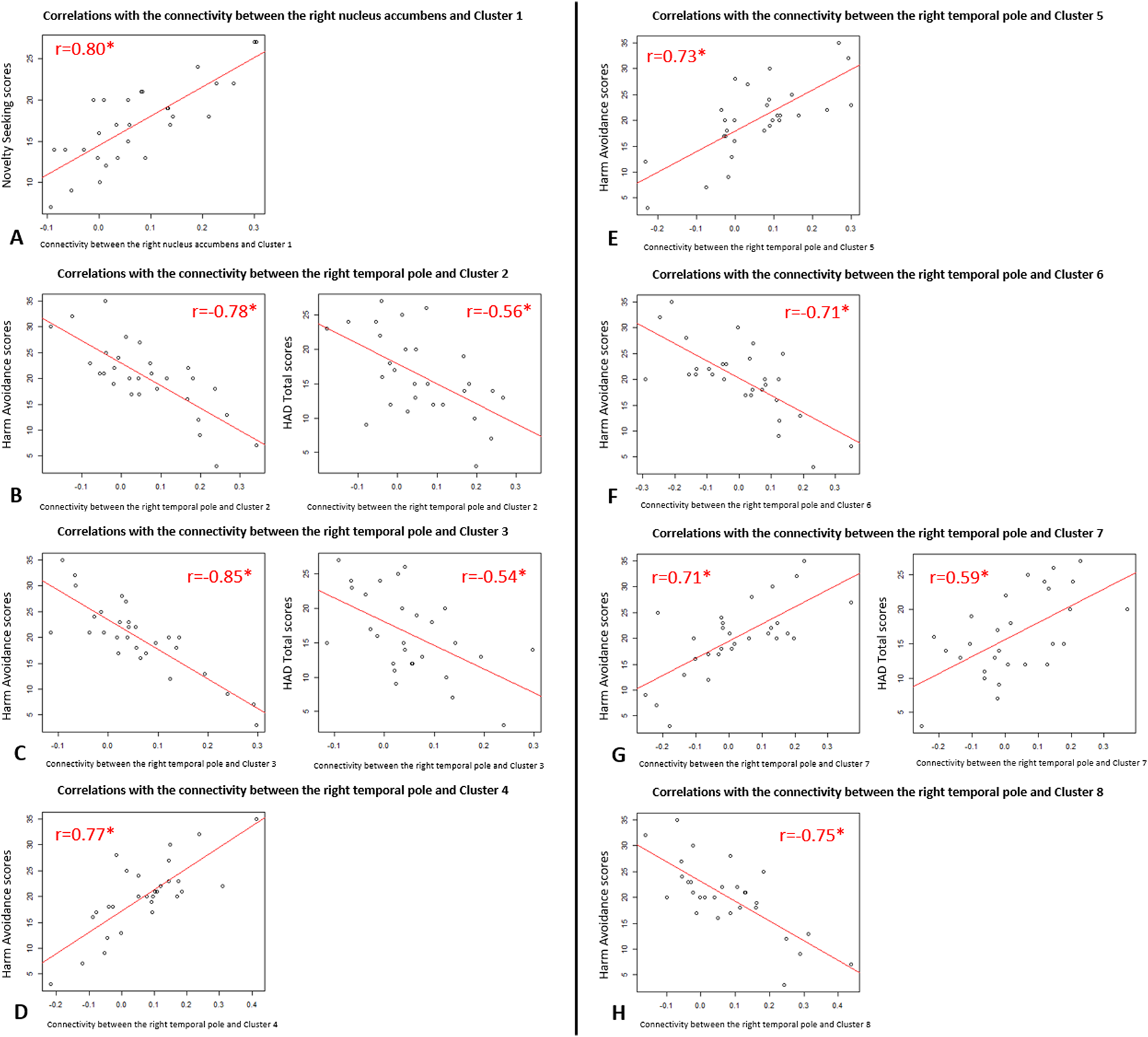 Scatter plots of the significant correlations between functional connectivity and clinical variables in Parkinson’s disease patients. Representations of the correlations of Pearson from Table 2: (A) Correlations between the functional connectivity of “the right nucleus accumbens and Cluster 1” and Novelty Seeking scores; (B) Correlations between the functional connectivity of “the right temporal pole and Cluster 2” and Harm Avoidance scores (on the left) and HAD Total scores (on the right); (C) Correlations between the functional connectivity of “the right temporal pole and Cluster 3” and Harm Avoidance scores (on the left) and HAD Total scores (on the right); (D) Correlations between the functional connectivity of “the right temporal pole and Cluster 4” and Harm Avoidance scores; (E) Correlations between the functional connectivity of “the right temporal pole and Cluster 5” and Harm Avoidance scores; (F) Correlations between the functional connectivity of “the right temporal pole and Cluster 6” and Harm Avoidance scores; (G) Correlations between the functional connectivity of “the right temporal pole and Cluster 7” and Harm Avoidance scores (on the left) and HAD Total scores (on the right); (H) Correlations between the functional connectivity of “the right temporal pole and Cluster 8” and Harm Avoidance scores.