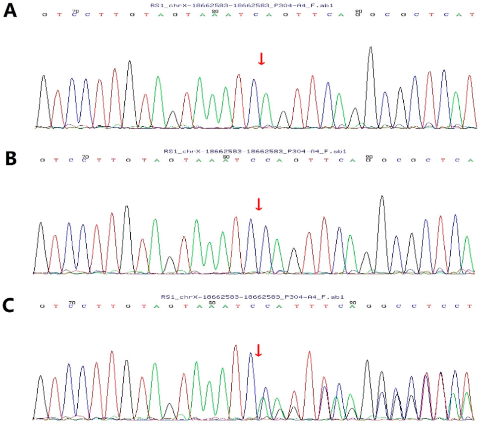 Figure 1. Sanger validation of c.489delC (p. Trp163Ter). (A) Patient: hemizygous; (B) The patient’s father: wild-type; (C) The patient’s mother: heterozygous.